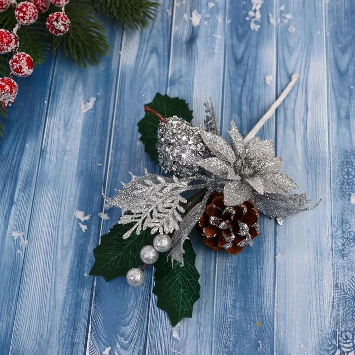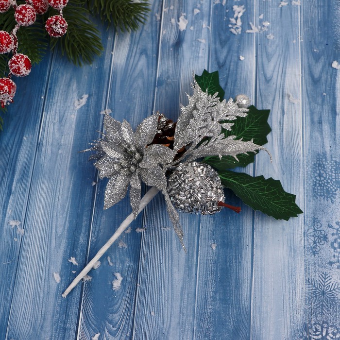 Еловая ветка декоративная «Зимнее волшебство. Грёзы», с цветком, 16 см — Характеристики
