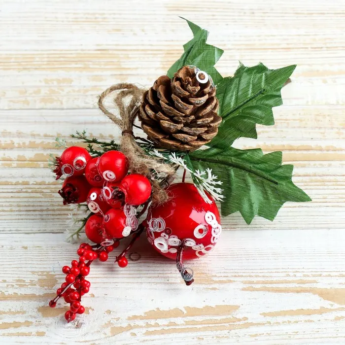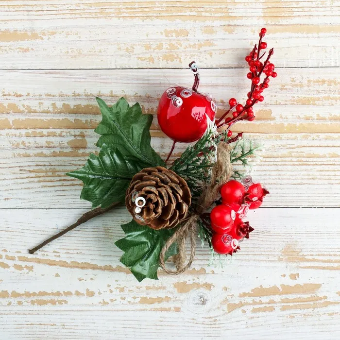 Эта декоративная новогодняя ветка выполнена из металла, дерева, пластика, бумаги и текстиля, высотой 17 см. В насыщенном красном цвете она станет ярким акцентом в праздничном интерьере и создаст атмосферу зимней сказки. Стиль сочетает элементы классики, скандинавского минимализма и шебби-шика, что делает ее универсальным украшением для различных новогодних композиций.