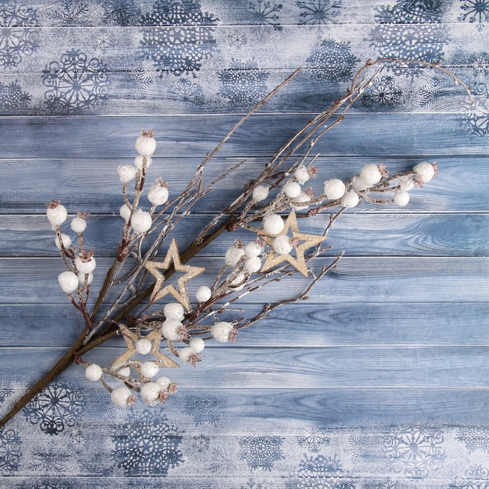 Эта декоративная ветка для новогоднего оформления выполнена в белом цвете и представляет собой композицию из металла, дерева, пластика и бумаги. Ее длина составляет 63 см. Такой элемент станет выразительным украшением зимних интерьеров, создавая атмосферу волшебства и чистоты, характерную для праздника Нового года.
