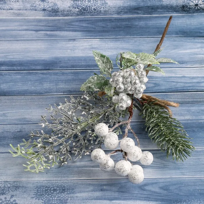 Эту ветку используют для создания праздничных букетов, гирлянд или композиций на столах и полках. Белые ягоды и натуральные материалы отлично сочетаются с серебристыми или золотыми украшениями, подчеркивая торжественность праздника. Ее можно комбинировать с другими декоративными элементами для формирования уникальных новогодних украшений, создавая уютную атмосферу дома или в коммерческих пространствах.