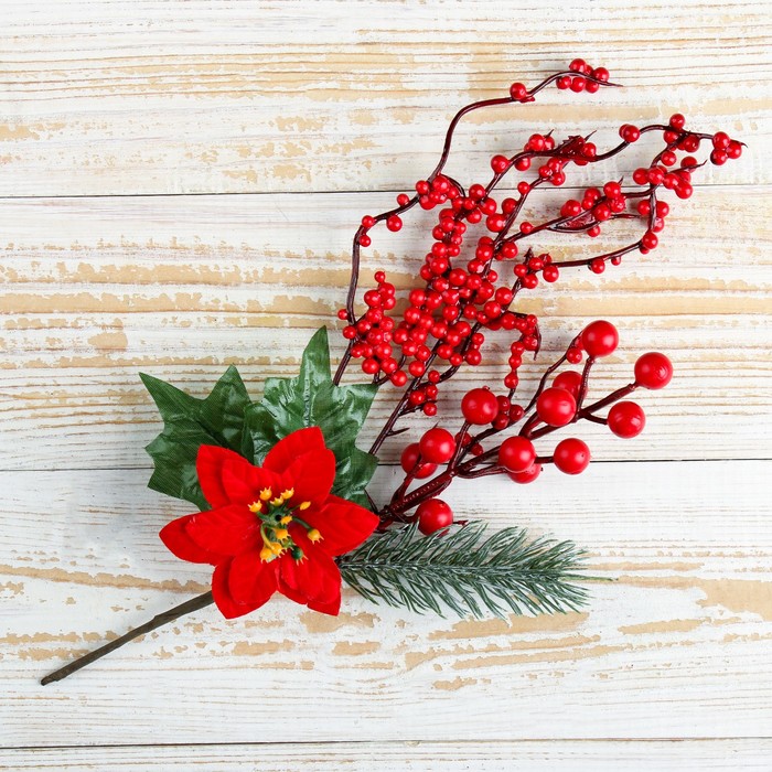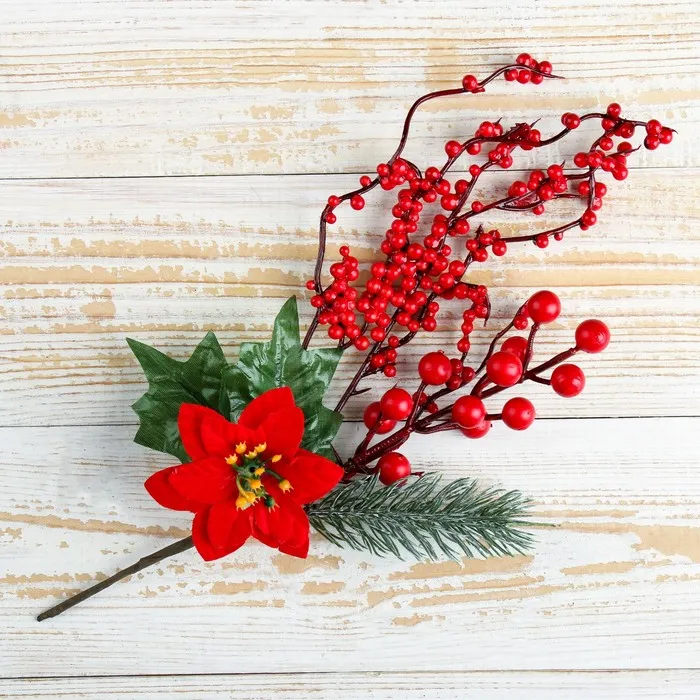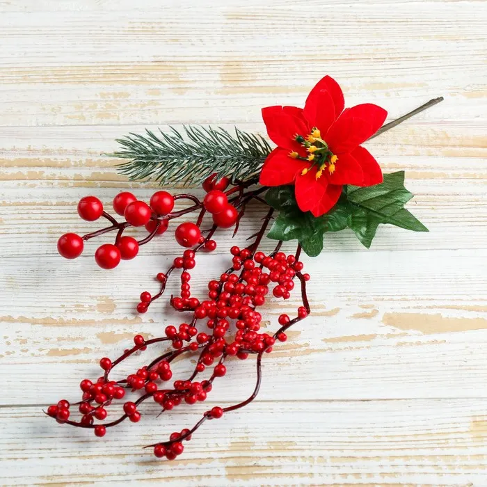 Эта декоративная новогодняя ветка выполнена в ярко-красных тонах и включает цветок, хвойные веточки и ягоды. Ее высота составляет 26 см, что делает ее универсальным элементом для украшения интерьера, праздничных композиций или витрин в зимний сезон.