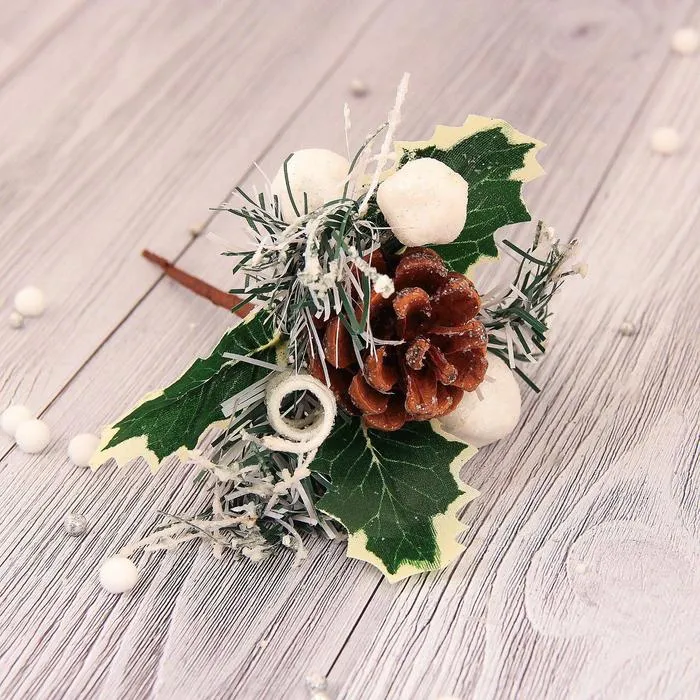 Эта декоративная ветка в белом цвете с шишкой и звездочкой создаёт атмосферу зимней сказки и праздничного уюта. Высотой 18 см, она идеально подходит для оформления новогодних композиций в скандинавском, классическом или шебби-шик стиле. Ее универсальный дизайн позволяет использовать как самостоятельный элемент, так и часть более сложных праздничных украшений, добавляя зимней магии и нежности в интерьер.