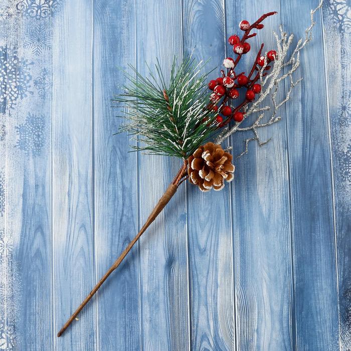 Еловая ветка декоративная «Зимнее волшебство. Очарование», хвоя в серебре, шишка, ягоды, 30 см — Характеристики