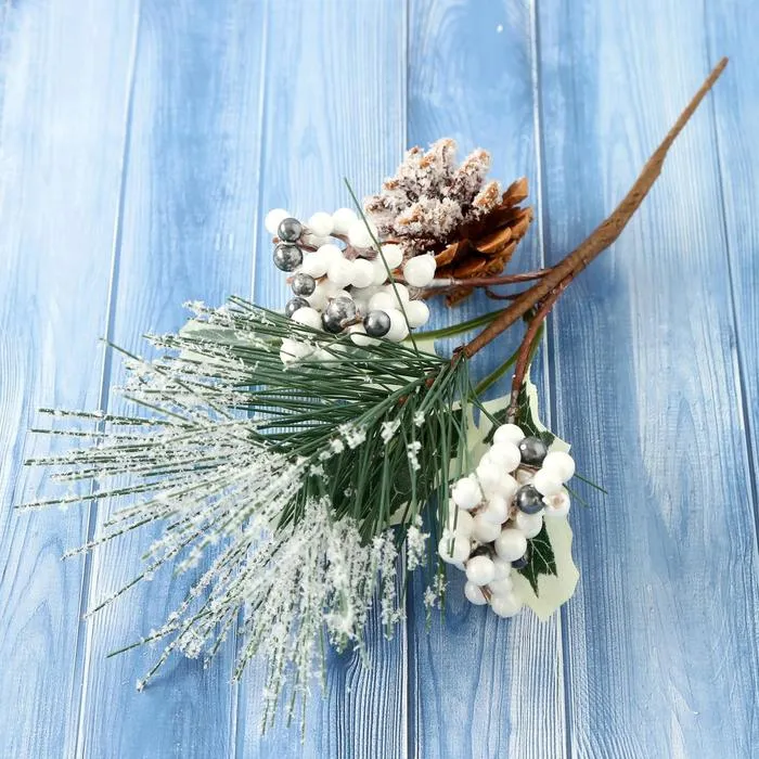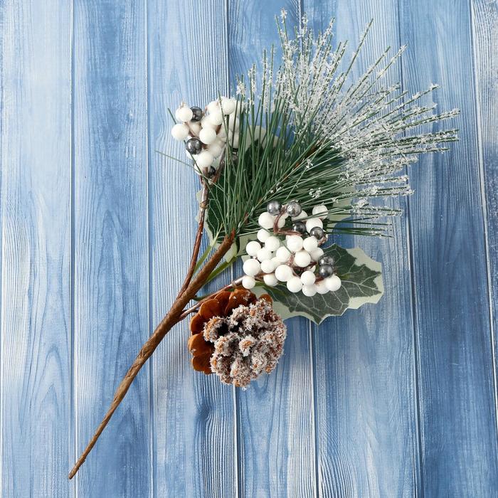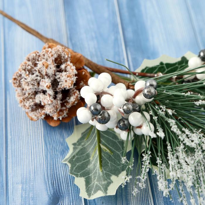 Еловая ветка декоративная «Зимнее волшебство. Очарование», хвоя в снегу, шишка, ягоды, 21 см — Характеристики