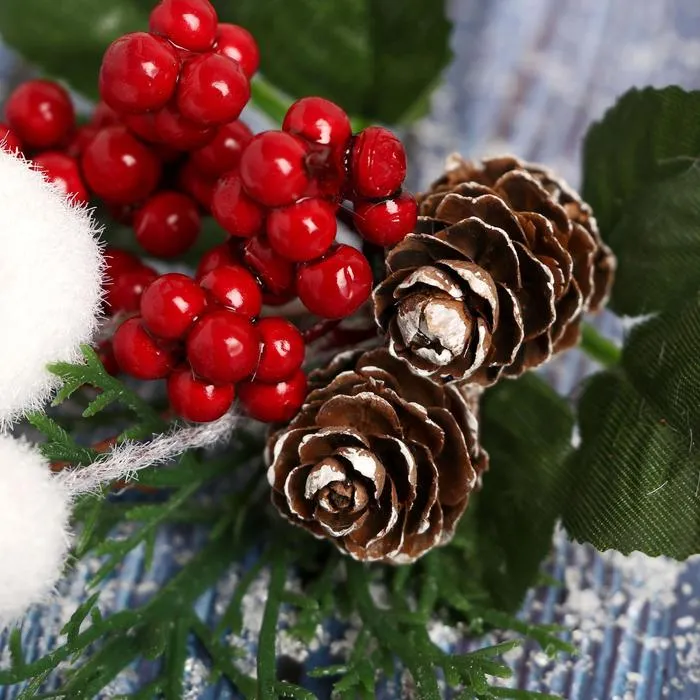 Эта ветка делает любое помещение частью вашей истории о чуде и подарках. Красные ягоды, шишки и белые грибы работают вместе, чтобы передать дух Нового года и семейное тепло предпраздничных дней. Используйте её как центральный элемент или как фон для других украшений — одинаково хорошо усиливает атмосферу торжества и доброжелательность интерьера.