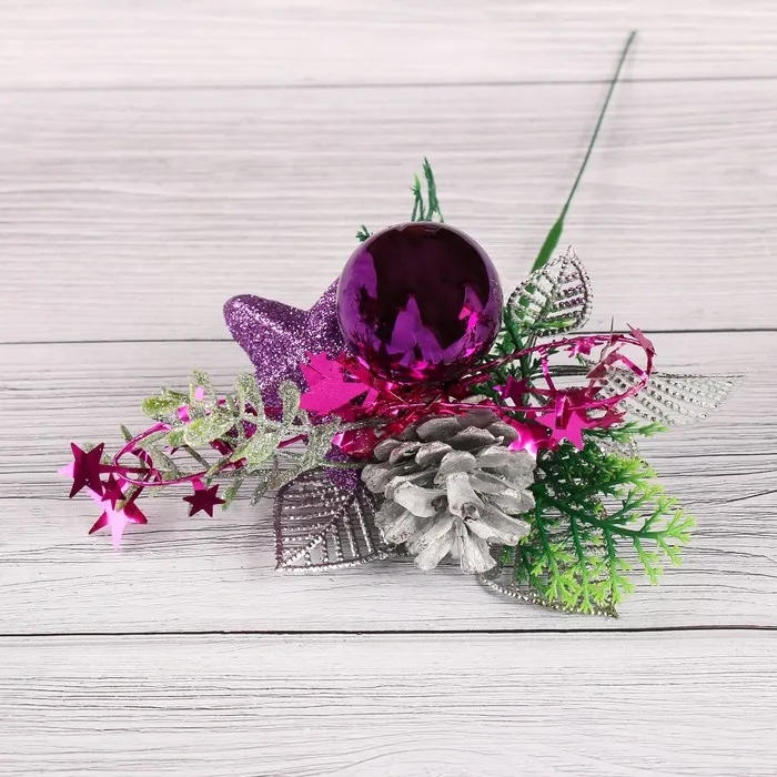 Эта декоративная ветка для новогоднего оформления выполнена из металла, дерева и пластика, высотой 15 см. В сиреневом цвете она создает атмосферу сказочного зимнего уюта и волшебства. Стиль фьюжн сочетает современные и классические элементы, что делает ее универсальным украшением для праздничных композиций и интерьеров, подчеркивая тему Нового года.