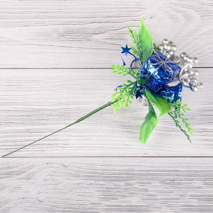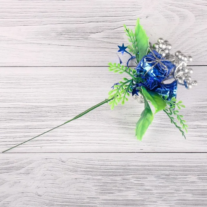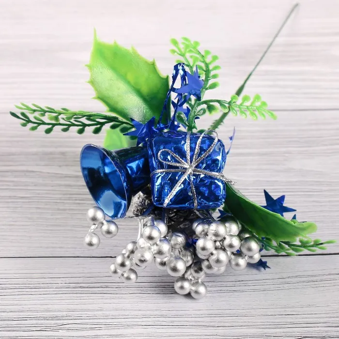 Эта декоративная ветка для новогоднего оформления выполнена в сине-серебристых тонах и включает колокольчик, шишку и элементы из металла, дерева и пластика. Высотой 15 см, она станет ярким акцентом в зимних композициях и праздничных интерьерах.