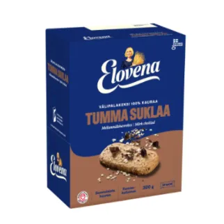 Elovena Снеки с тёмным шоколадом превосходен в качестве закуски. Это цельнозерновое печенье с высоким содержанием клетчатки - 100% овес, обжаренный с рапсовым маслом и отмеченный знаком сердца Финской ассоциации кардиологов.