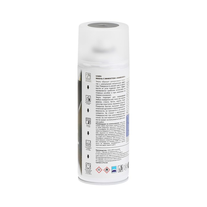 Эмаль VIXEN образует декоративное покрытие с уникальным визуальным эффектом. Поверхность меняет цвет в зависимости от угла падения света. Эффект проявляется наиболее интенсивно на плавных изгибах и при нанесении на тёмное основание. Эмаль подходит для окрашивания любых поверхностей, таких как металл, дерево, стекло, бетон, кирпич, большинство пластиков, керамика и прочих. Покрытие быстро высыхает. Обладает отличной адгезией к окрашиваемой поверхности, не трескается и не отшелушивается. Не стекает с вертикальных поверхностей при равномерном нанесении. За счёт хорошей атмосферостойкости может использоваться для внешних работ.