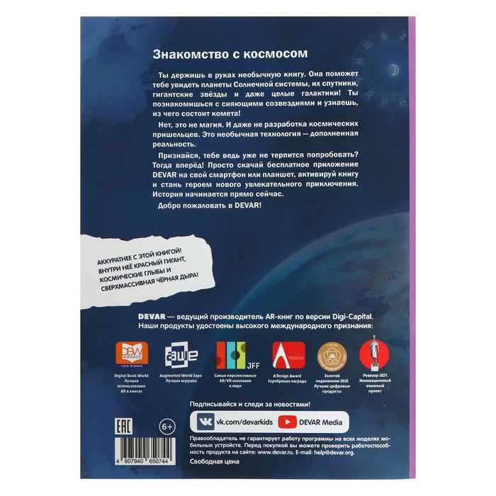 Энциклопедия с дополненной реальностью «Знакомство с космосом» превращает страницы книги в стартовую площадку для космического путешествия. Ребёнок увидит, как выглядит Марс изнутри, разберётся, где находится самая высокая гора Солнечной системы и почему Венера — самая горячая планета. Формат, яркие иллюстрации и 32 насыщенные фактами страницы делают процесс обучения понятным и увлекательным.