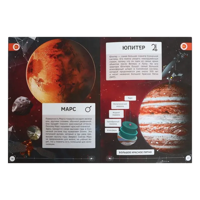 Книга даёт возможность «полететь» в космос не только мыслью, но и глазами. С помощью приложения ребёнок увидит, как вращается Земля, как выглядит Олимп на Марсе и как движутся кольца Сатурна. Это не просто картинки, а объёмные проекции, которые можно рассмотреть со всех сторон.