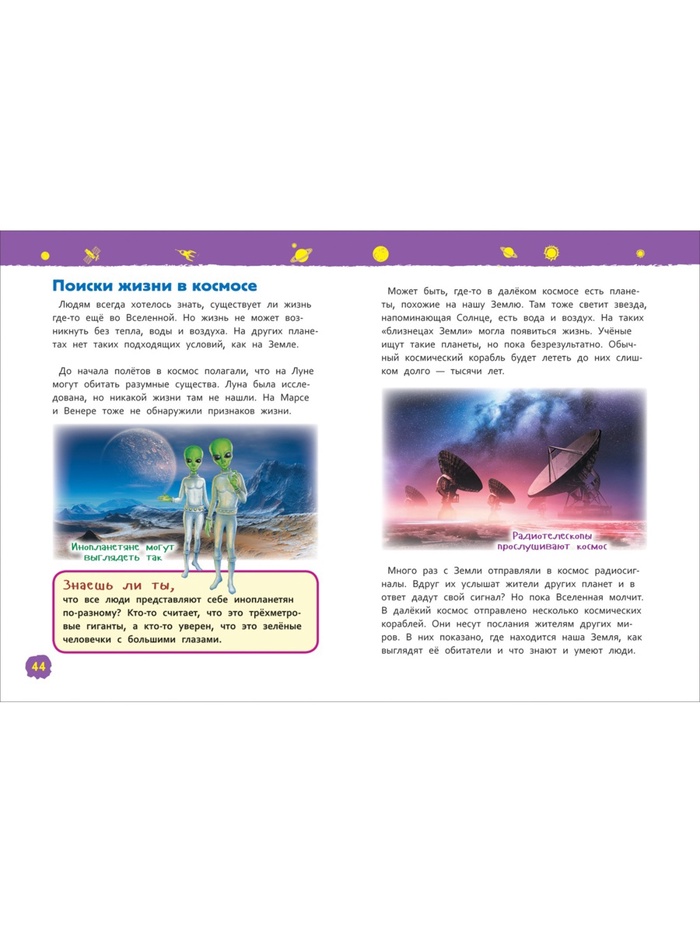 • В книге рассказывается о Солнечной системе, кометах, астероидах и мечтах человечества покорить космос.