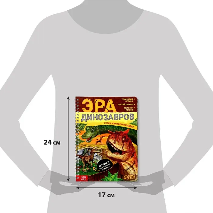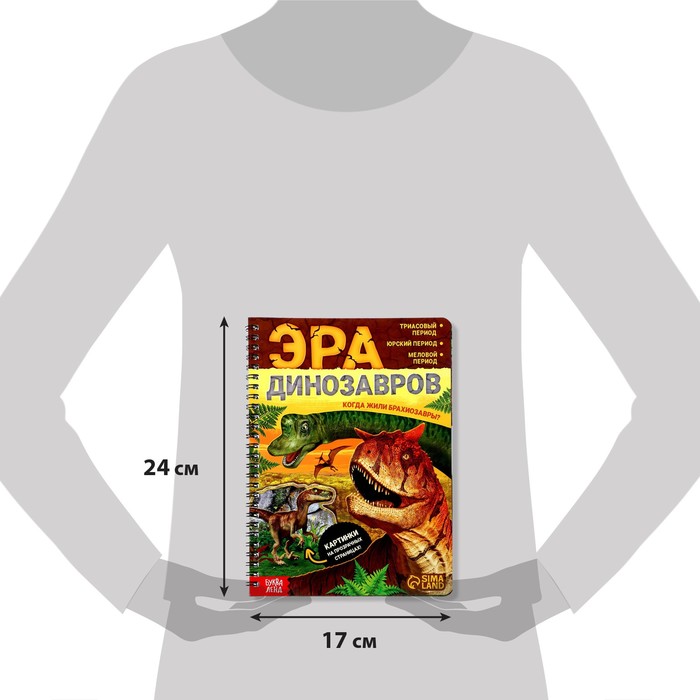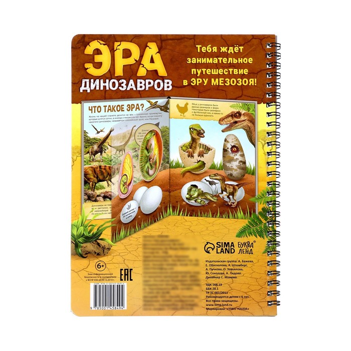 На красочных страницах книги «Эра динозавров» собраны интересные научные факты об ископаемых рептилиях. А ещё в издании есть прозрачные интерактивные страницы. Рассматривая их, ребёнок узнает, как выглядело яйцо динозавра изнутри, с чем можно сравнить диплодока и как палеонтологи обнаруживают свои находки.