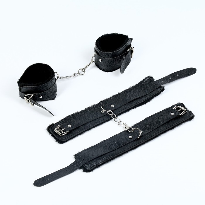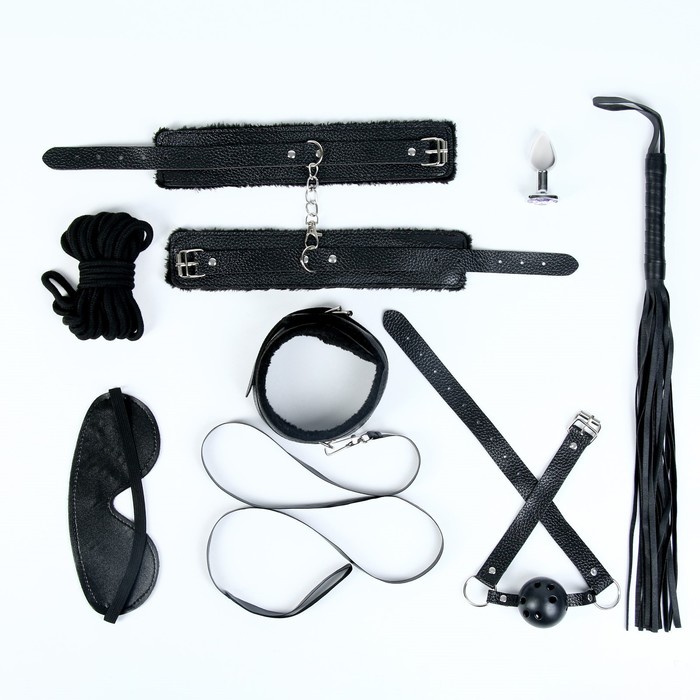 БДСМ набор выполнен из эко-кожи с искусственным мехом. Все ремни имеют систему регулировки. В состав набора входят 8 предметов: наручники, кляп, ошейник, поводок, верёвка,маска, анальная пробка, плеть. Кляп выполнен из эко-кожи и abs пластика. Шарик имеет оптимальный размер, хорошо помещается в рот, а ремешок имеет систему регулировки, так что он подойдет и для нее и для него. Наручники и ошейник с меховой вставкой, которая обеспечит приятное прилегание к телу. Поводок крепится к ошейнику при помощи карабина, имеет длину 103 см. Хлопковая верёвка для связывания 5 м. Анальная пробка из медицинской стали с кристаллом. Диаметр пробки 2,8 см небольшой размер поможет постепенно растянуть и подготовить мышцук анальному сексу.