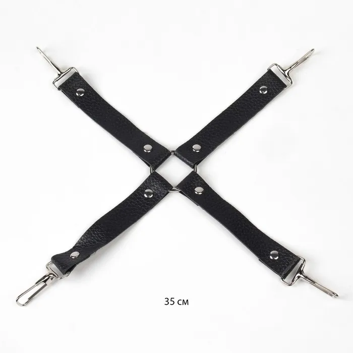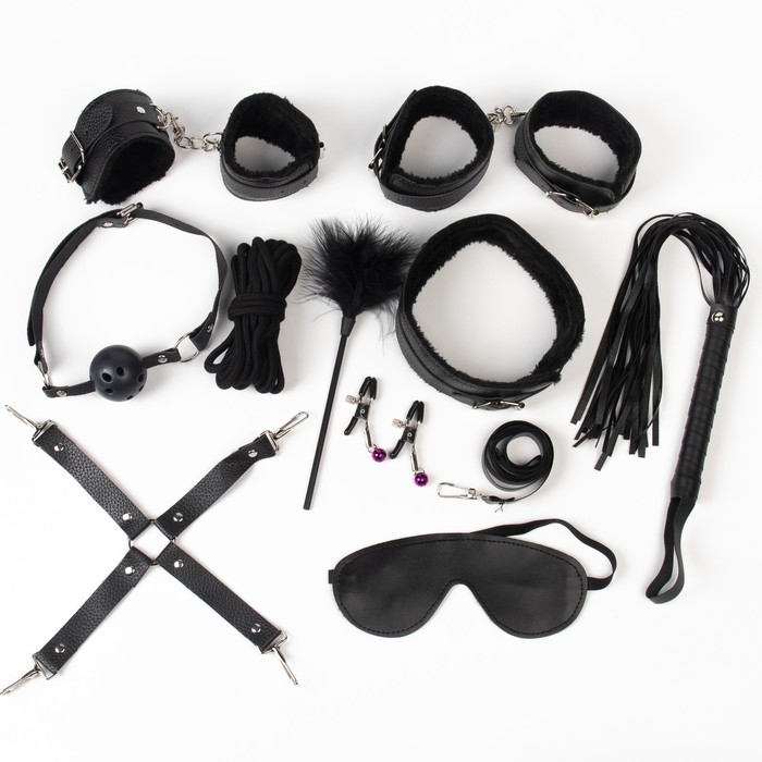 БДСМ набор выполнен из эко-кожи с искусственным мехом. Все ремни имеют систему регулировки. В состав набора входят 11 предметов: наручники, оковы, кляп, ошейник, поводок, верёвка, маска, зажимы для сосков, плеть, крестовина, пуховка.