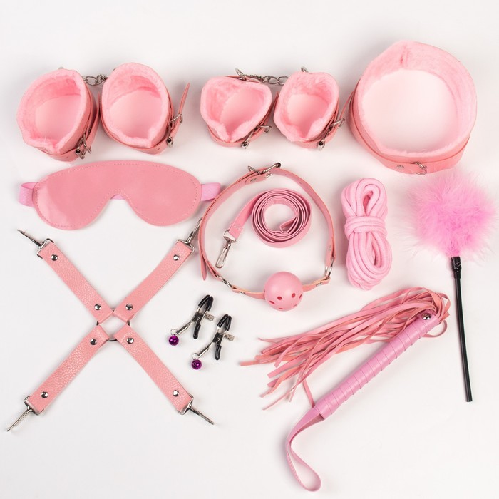 БДСМ набор выполнен из эко-кожи с искусственным мехом. Все ремни имеют систему регулировки. В состав набора входят 11 предметов: наручники, оковы, кляп, ошейник, поводок, верёвка, маска, зажимы для сосков, плеть, крестовина, пуховка.