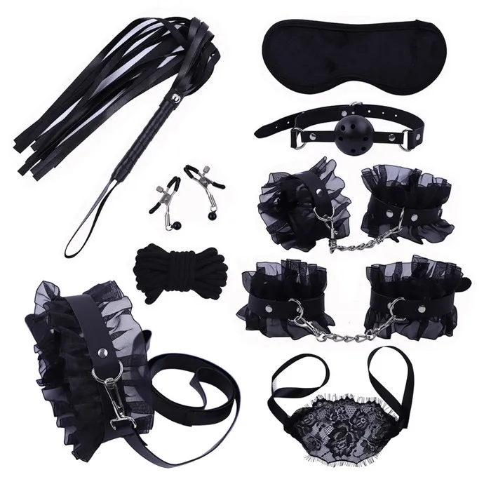 БДСМ набор выполнен из эко-кожи с искусственным мехом. Все ремни имеют систему регулировки. В состав набора входят В состав набора входят 9 предметов: наручники, оковы, кляп, ошейник, поводок, верёвка, маска, зажимы для сосков, плеть.