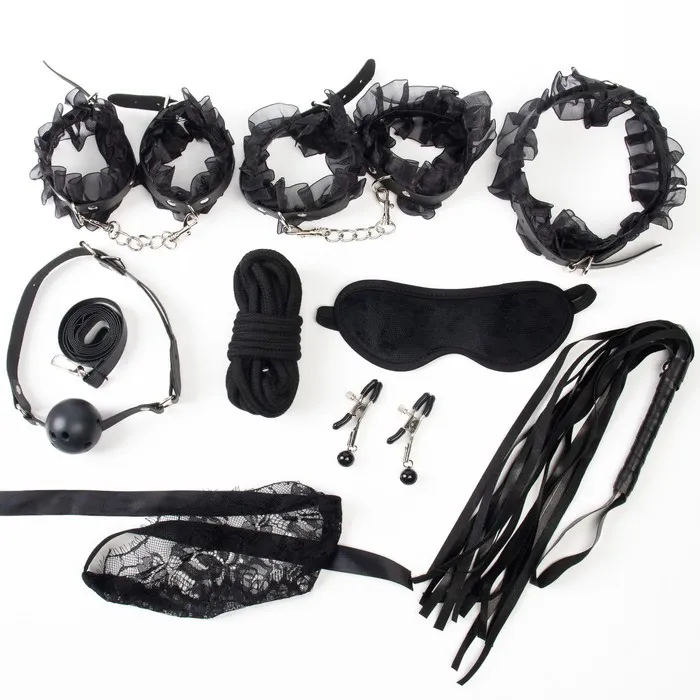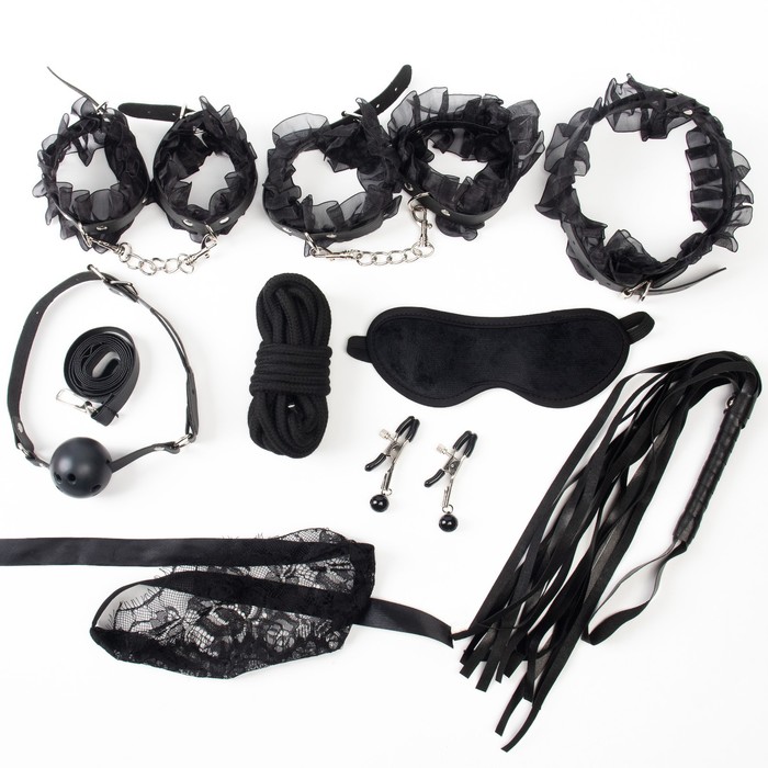 Кляп выполнен из эко-кожи и abs пластика. Шарик имеет оптимальный размер, хорошо помещается в рот, а ремешок имеет систему регулировки, так что он подойдет и для нее, и для него. Поводок крепится к ошейнику при помощи карабина, имеет длину 103 см. Хлопковая верёвка для связывания 5 м. Плеть выполнена из эко-кожи. Зажимы для сосков с колокольчиками регулируются, что обеспечит комфортное ношение.