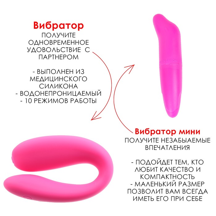 Вибратор для пар, выполненный из медицинского силикона, позволит получить одновременное удовольствие для двух партнёров. Игрушка стимулирует три зоны: точку G, клитор и пенис партнёра. Тонкую часть вибратора необходимо ввести во влагалище, а другую его часть положить на клитор. В таком состоянии игрушку можно использовать во время секса, соло-практик, также можно использовать в качестве вкладыша в трусики.Набор анальных пробок из медицинской стали . Набор поможет постепенно растянуть и подготовить мышцук анальному сексу. Анальная пробка подойдёт для ношения, ограничитель на основании не позволит игрушке ускользнуть в прямую кишку. Пробка подарит ощущение наполненности и создаст эффект двойного проникновения. Анальные бусы выполнены из гипоаллергенного ABS-пластика. Диаметр бусин от 1 см до 2.5 см. Разный размер бусин поможет постепенно растянуть и подготовить мышцу к анальному сексу.Гелевый вибратор из мягкого силикона обеспечит приятное введение игрушки во внутрь. Интенсивность вибрации контролируется поворотом колёсика. Питание от 2 батареек типа АА, в комплект не входят. Мини-вибратор выполнен из abs пластика. Игрушку можно использовать для стимуляции разных зон, таких как: соски, клитор, половые губы. Питание от батарейки типа АА. Набор эрекционных колец выполнен из гипоаллергенного силикона. Кольца с диаметром 30 mm, 25 mm, 23 mm. Эрекционные кольца помогают предотвратить преждевременную эякуляцию. При слабой эрекции делают её ярко выраженной.Эрекционное кольцо с вибрацией из мягкого силикона. Эластичный материал не натирает , идеально подойдёт как для мошонки, так и для пениса. Вибропуля позволит одновременно стимулировать пенис и клитор. Эрекционное кольцо позволит продлить половой акт и сделать ощущения более яркими во время оргазма. Для работы устройства нужны 2 батарейки типоразмера LR44. В комплект не входят.Плётка выполнена из эко-кожи. Размер плётки 55 см. Плётка состоит из жёсткой рукояти и мягких хвостов. Удобно ложится в руку, эко-кожа не позволит выскользнуть. Подходит для BDSM-практик.Кляп выполнен из эко-кожи и гипоаллергенного силикона. Рамка имеет оптимальный размер, хорошо помещается в рот, а ремешок имеет систему регулировки, так что он подойдет и для нее и для него.Комбинезон выполнен из эластичной сетки. Изящно подчёркивает силуэт, обеспечит идеальную посадку по фигуре. Эротический вырез снизу.
