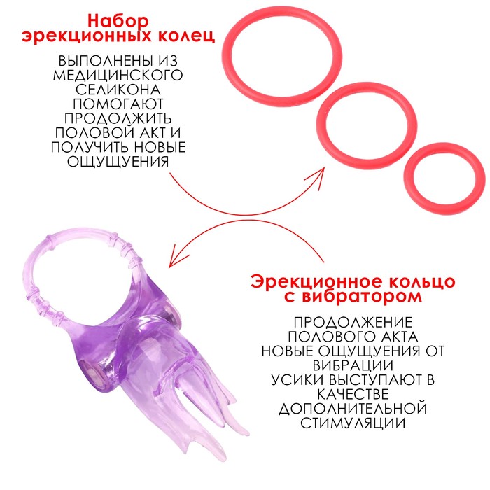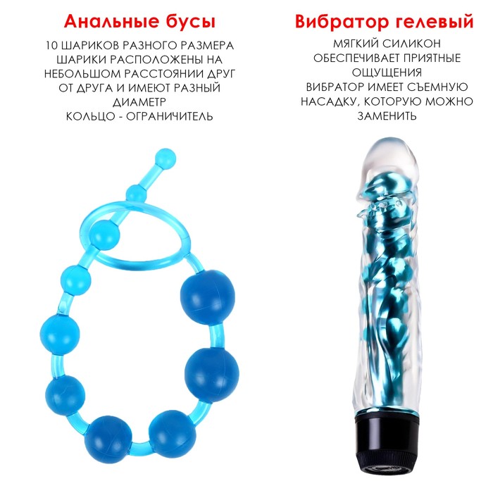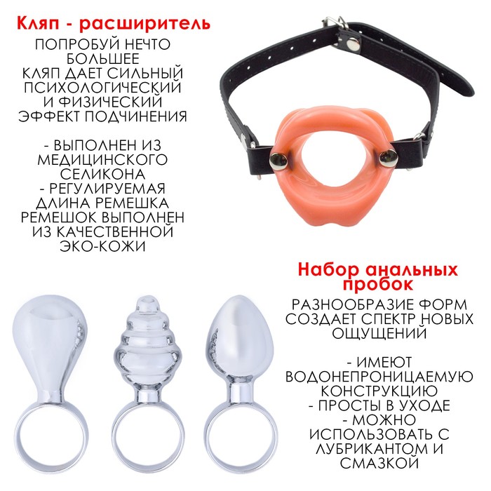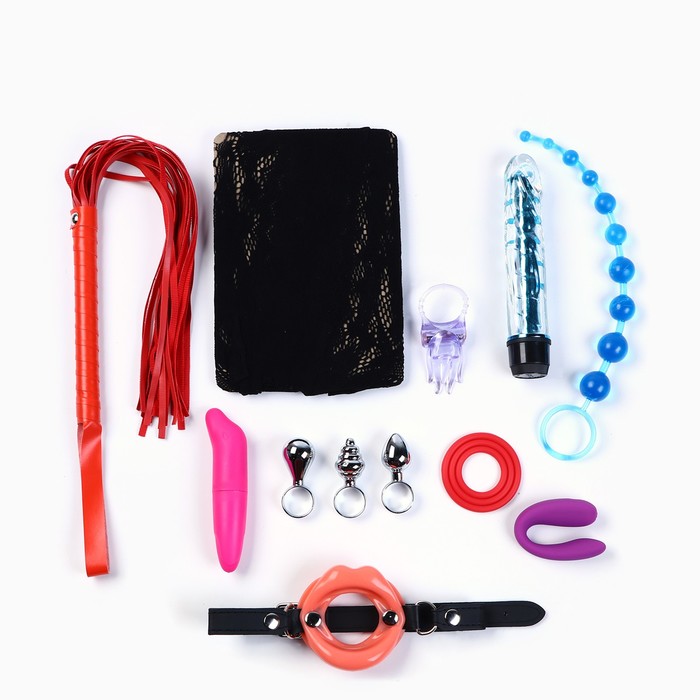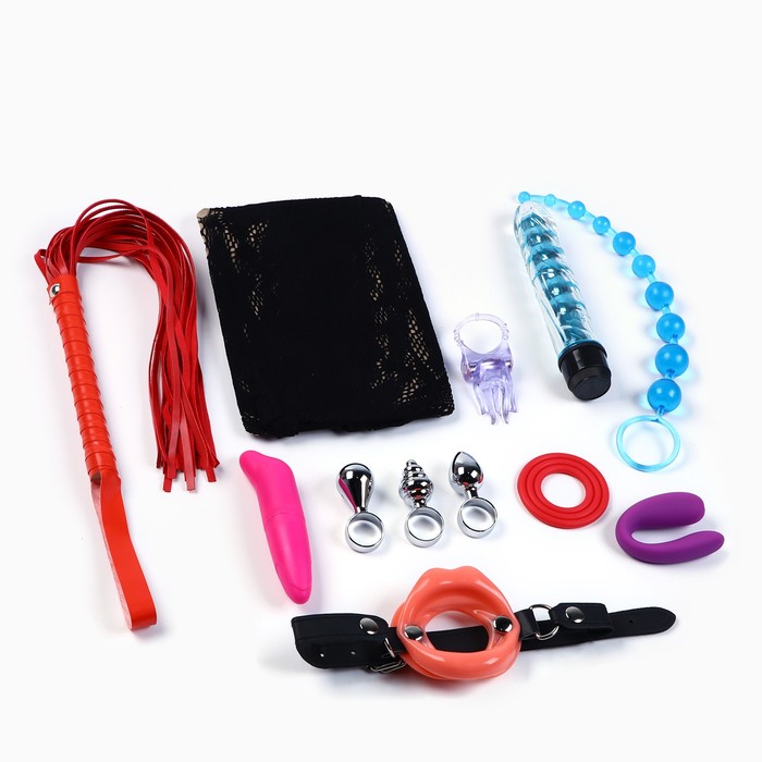 В состав набора входит 15 предметов: вибратор для пар, набор анальных пробок, анальные бусы, гелевый вибратор, мини вибратор, набор эрекционных колец, кольцо с вибрацией, плеть, кляп и эротический комплект из сетки.