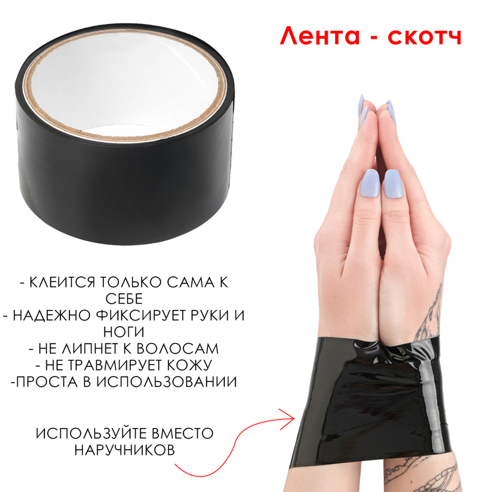 В состав набора входит 5 предметов: шлёпалка, зажимы для сосков, лента для связывания,сплошная маска и эротический комплект из сетки.