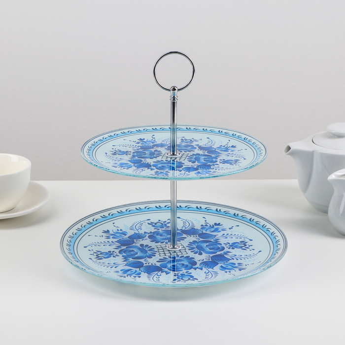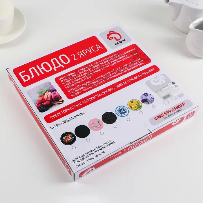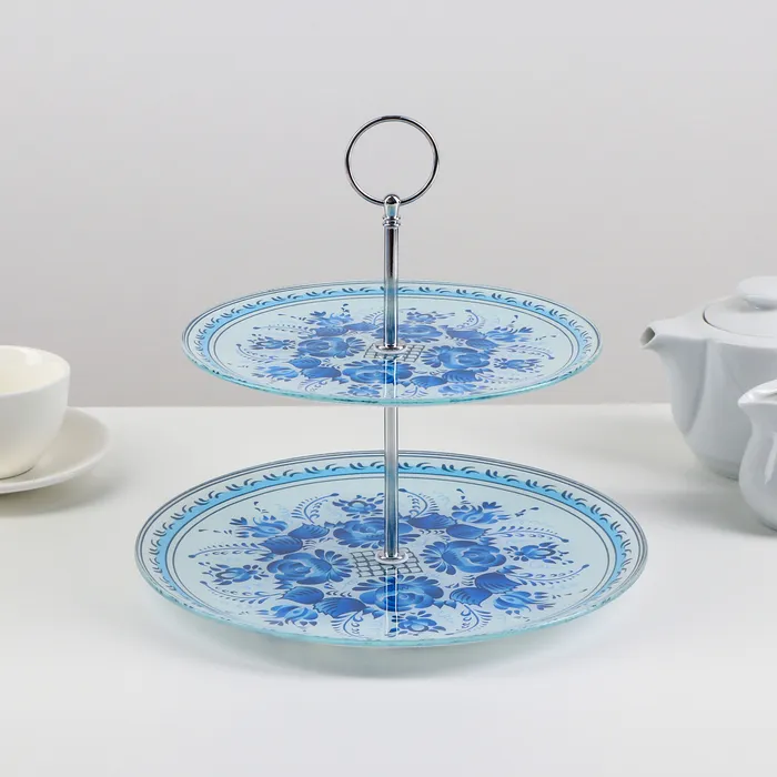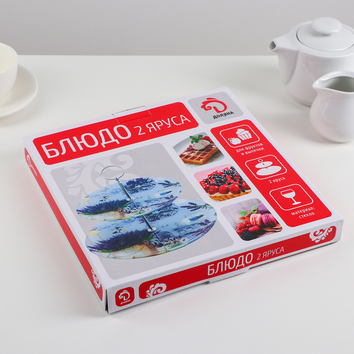 Оригинальное 2-х ярусное блюдо придаст современный вид любому столу. Блюдо можно использовать для подачи фруктов и различных кондитерских изделий. Благодаря красочному дизайну эта посуда станет чудесным украшением праздничного стола и дополнит Ваш интерьер.