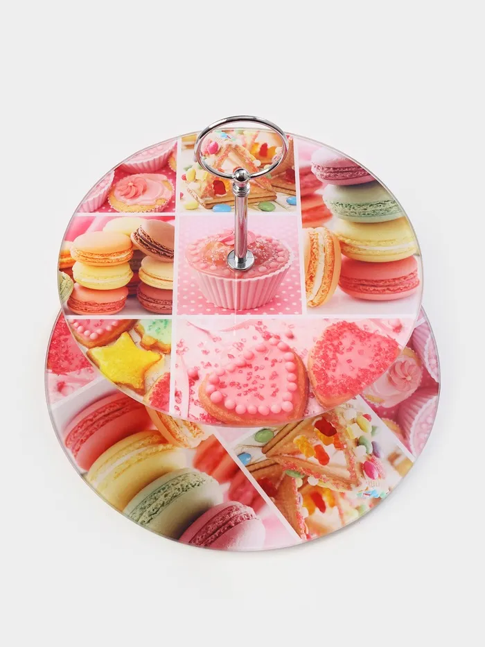 Оригинальное 2-х ярусное блюдо изготовлено из качественного и прочного стекла. Блюдо можно использовать для подачи фруктов и различных кондитерских изделий. Благодаря красочному дизайну эта посуда станет чудесным украшением праздничного стола.
