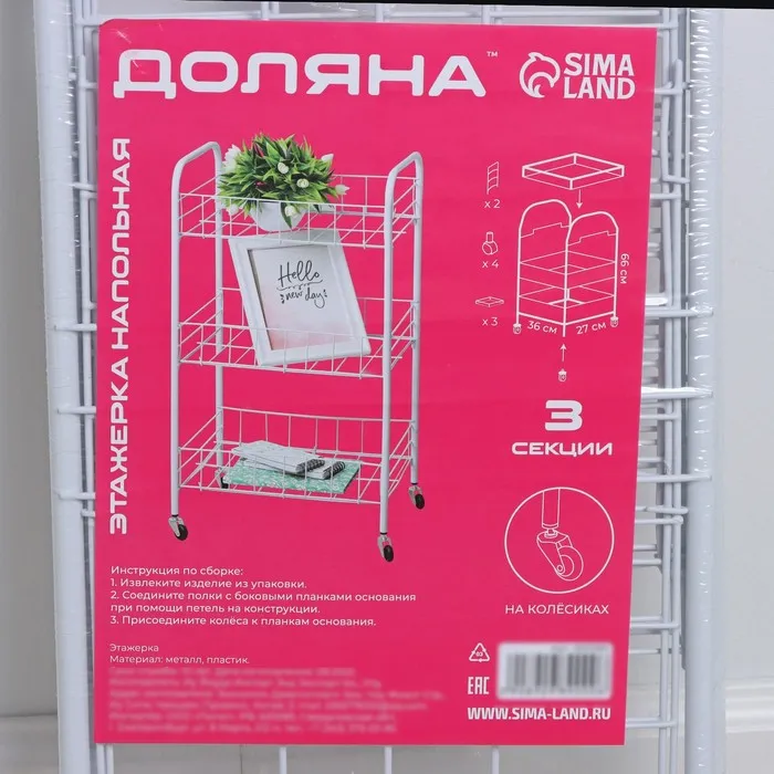Этажерка напольная 3-х секционная, на колёсиках, 27×36×66 см, белая — Характеристики