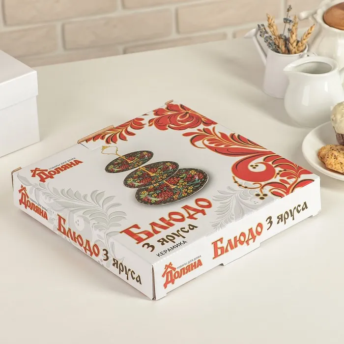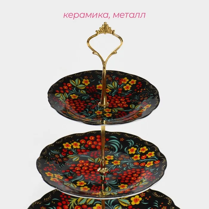 Этажёрка для фруктов и десертов Доляна «Хохлома», 3 яруса, d=15/18/23 см, h=34 см, керамика, чёрная — Характеристики