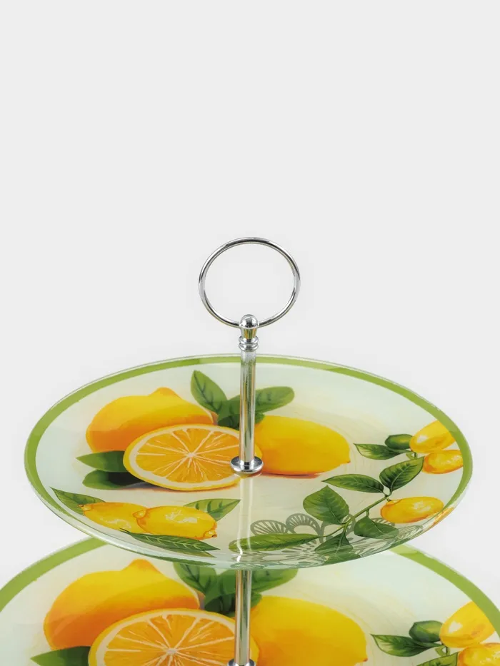 Оригинальное 2-х ярусное блюдо изготовлено из качественного и прочного стекла. Блюдо можно использовать для подачи фруктов и различных кондитерских изделий. Благодаря красочному дизайну эта посуда станет чудесным украшением праздничного стола.