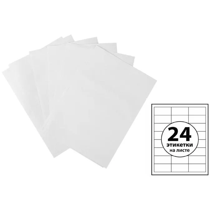 Этикетки А4 самоклеящиеся, 100 листов, 80 г/м², на листе 24 этикетки размером 33.8×64.2 мм, глянцевые, белые — Характеристики