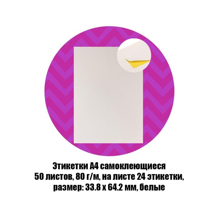 Этикетки А4 самоклеящиеся, 50 листов, 80 г/м², на листе 24 этикетки размером 33.8×64.2 мм, матовые/глянцевые, белые — Характеристики