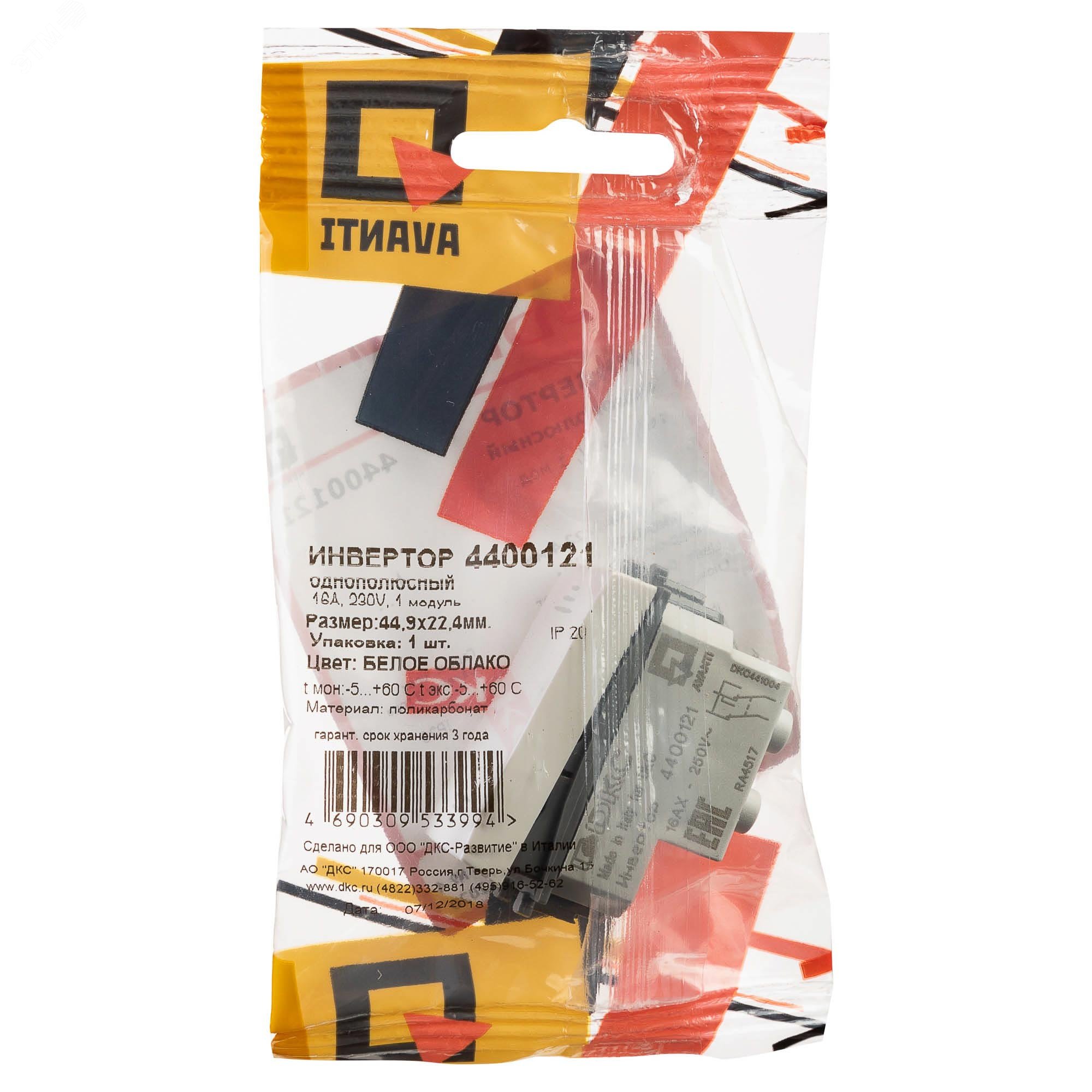 Инвертор модульный. Предназначен для монтажа в систему пластиковых коробов ''In-liner Front'' и систему организации рабочих мест ''Sotto'' при помощи рамок-суппортов и каркасов ''Avanti'' (код 4400912 и т.д.). Используется для включения/выключения освещения с трех и более точек. Диаметр отверстий для ввода кабелей - 3 мм (по 2 отверстия на одну клемму). Винтовые зажимы. Шаблон для зачистки кабеля - 11 мм. Номинальный ток - 16 A. Номинальное напряжение - 230 В. Фиксация в подрозеточные коробки при помощи каркаса с лапками (код 4400802) и саморезов. 1 модуль. Цвет – ''Белое облако''.