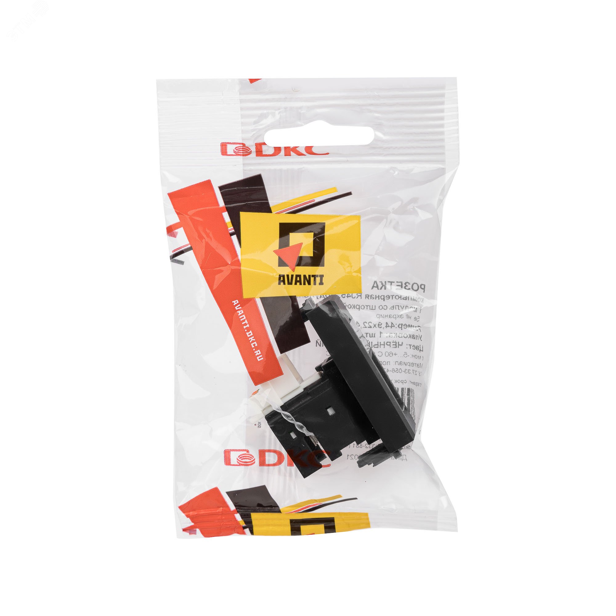 Компьютерная розетка RJ-45 модульная. Категория: 5е. Предназначена для монтажа в систему пластиковых кабельных коробов ''In-liner Front'' и систему организации рабочих мест ''Sotto'' (в т.ч. кабель-каналы и короба ''Aero'') при помощи рамок-суппортов и каркасов ''Avanti'' (код 4400912 и т.д.), подключение сетевого кабеля к рабочему месту. Характеристики: 8P8C, с пылезащитной шторкой, с маркировочной табличкой, в комплекте разъем Keystone. Заделка не требует инструмента. Фиксация производится в подрозеточные коробки глубиной не менее 45 мм при помощи каркаса с лапками (код 4400802) и саморезов. 1 модуль. Цвет: ''Черный матовый''