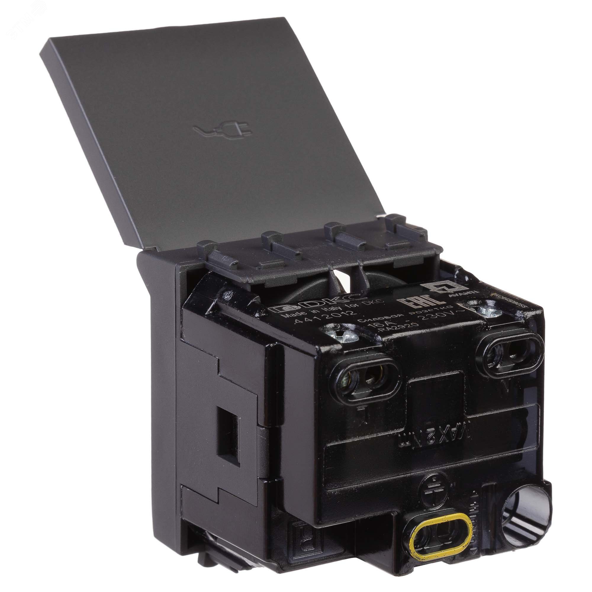 Розетка 2P+E (однофазная розетка с заземлением) модульная с крышкой от ДКС применяется для подключения различных электроприборов. Изделие предназначено для монтажа в систему пластиковых кабельных коробов ''In-liner Front'' и систему организации рабочих мест ''Sotto'' (в т.ч. кабель-каналы и короба ''Aero'') при помощи рамок-суппортов и каркасов ''Avanti'' (код 4400912 и т.д.). Лаконичные формы электроустановочных изделий ''Avanti'' отлично сочетаются с глубокими цветами. Пластиковые части устройства имеют оттенок ''Черный матовый''. Это темный насыщенный цвет, который легко сочетается с любыми оттенками, придавая им оттенок богемной утонченности. Производитель оставляет за собой право вносить во внешний вид изделия изменения, которые не влияют на его функционал, безопасность и надежность.
