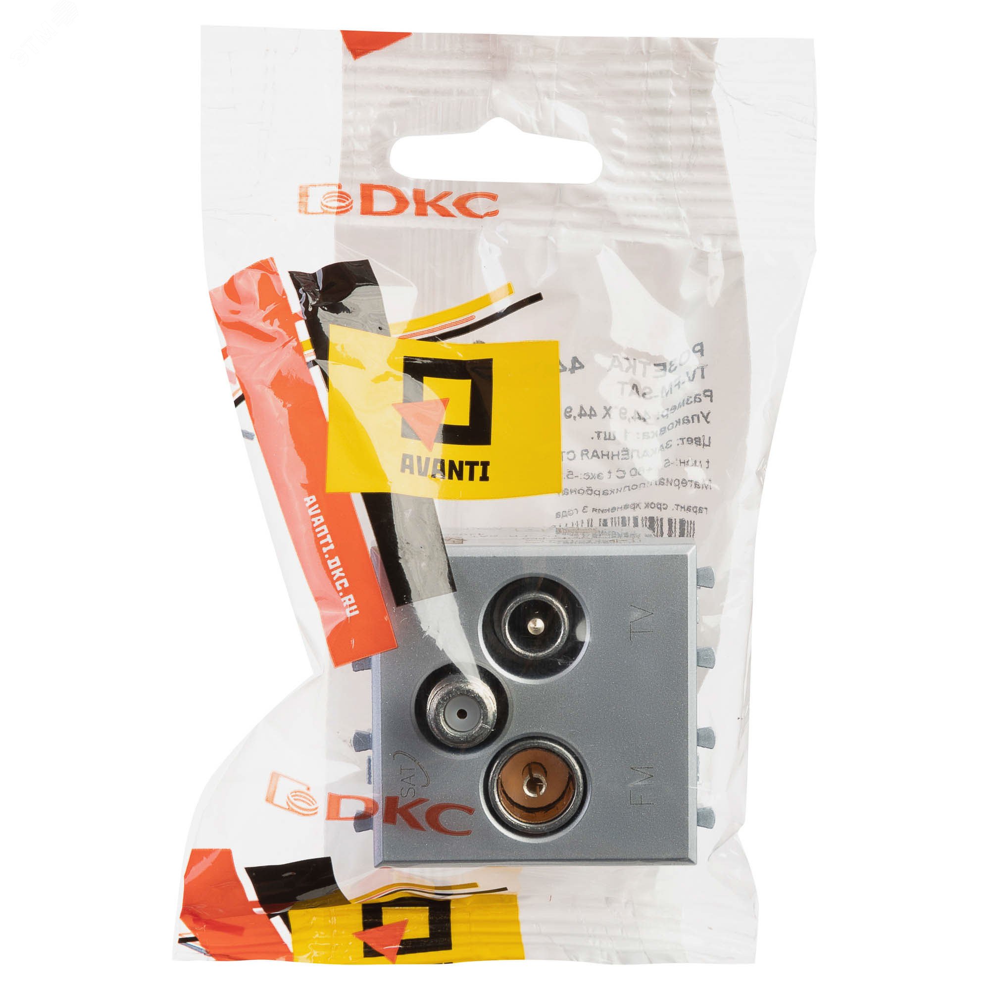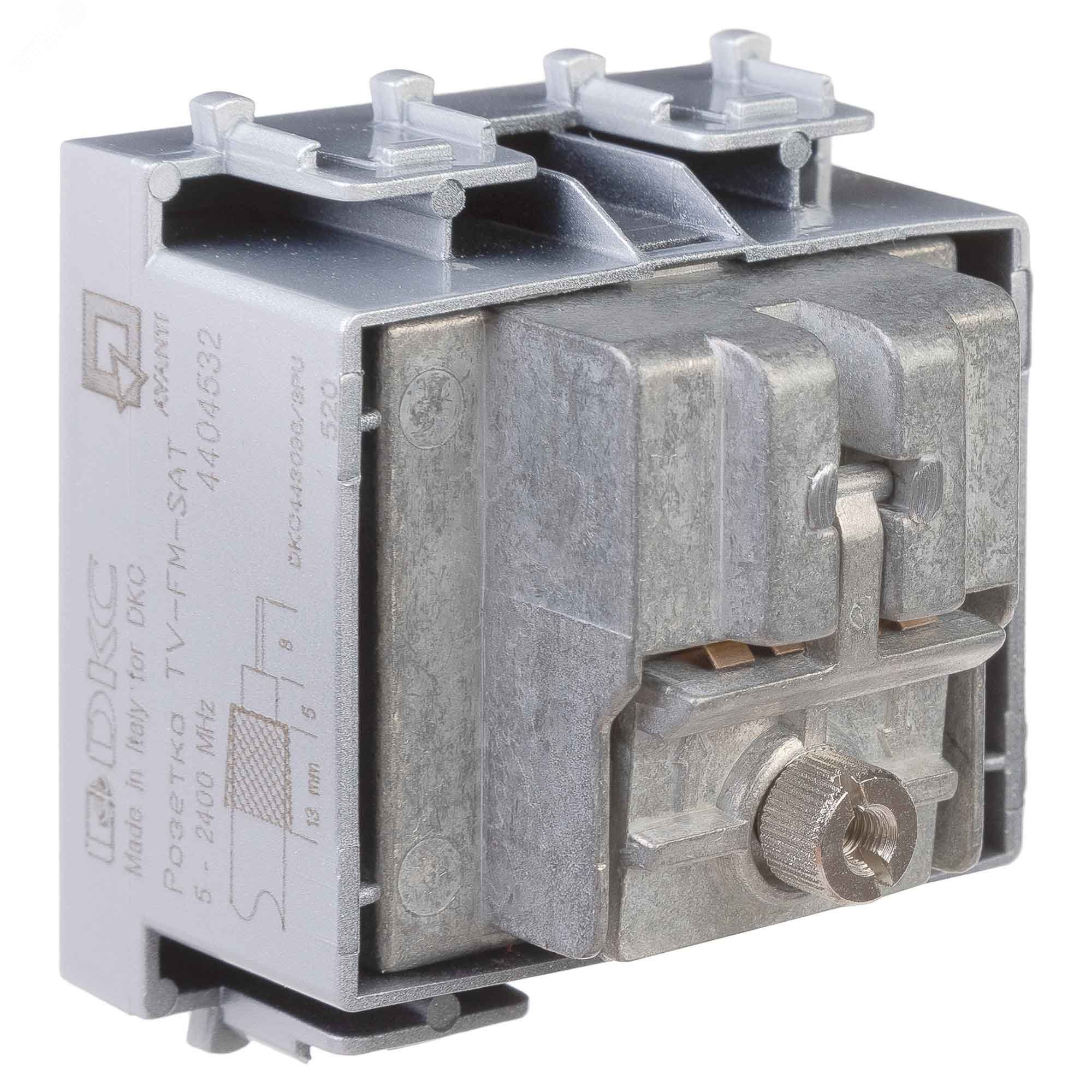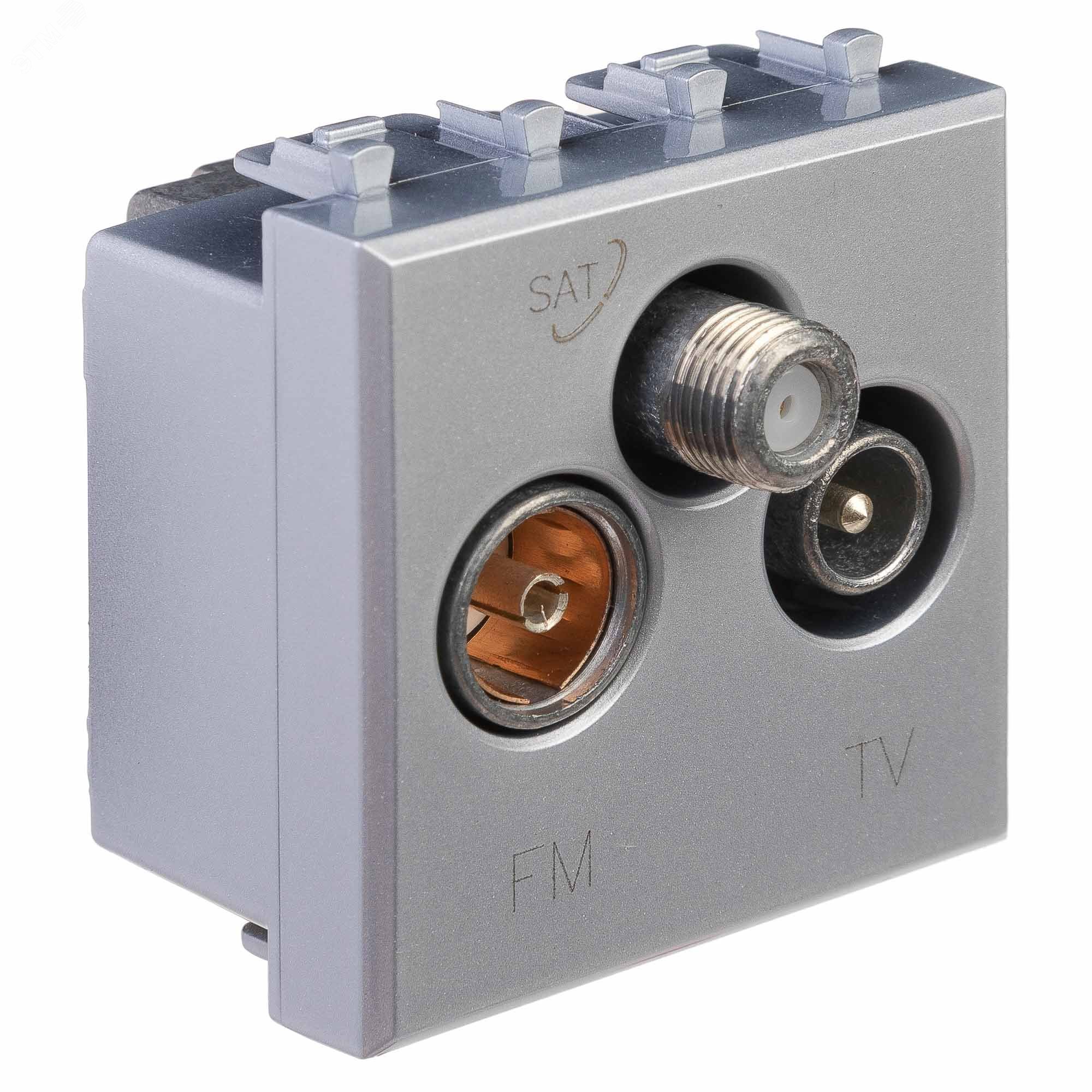 Розетка TV-FM-SAT модульная. Назначение: для монтажа в систему кабельных коробов ''In-liner Front'' и систему организации рабочих мест ''Sotto'' (алюминиевые кабель-каналы, колонны, башенки и лючки) при помощи рамок-суппортов и каркасов ''Avanti'' (код 4400912 и т.д.), подключение теле- и радиокабеля. Характеристики: винтовые зажимы, диапазон рабочих частот 4–2400 МГц, затухание