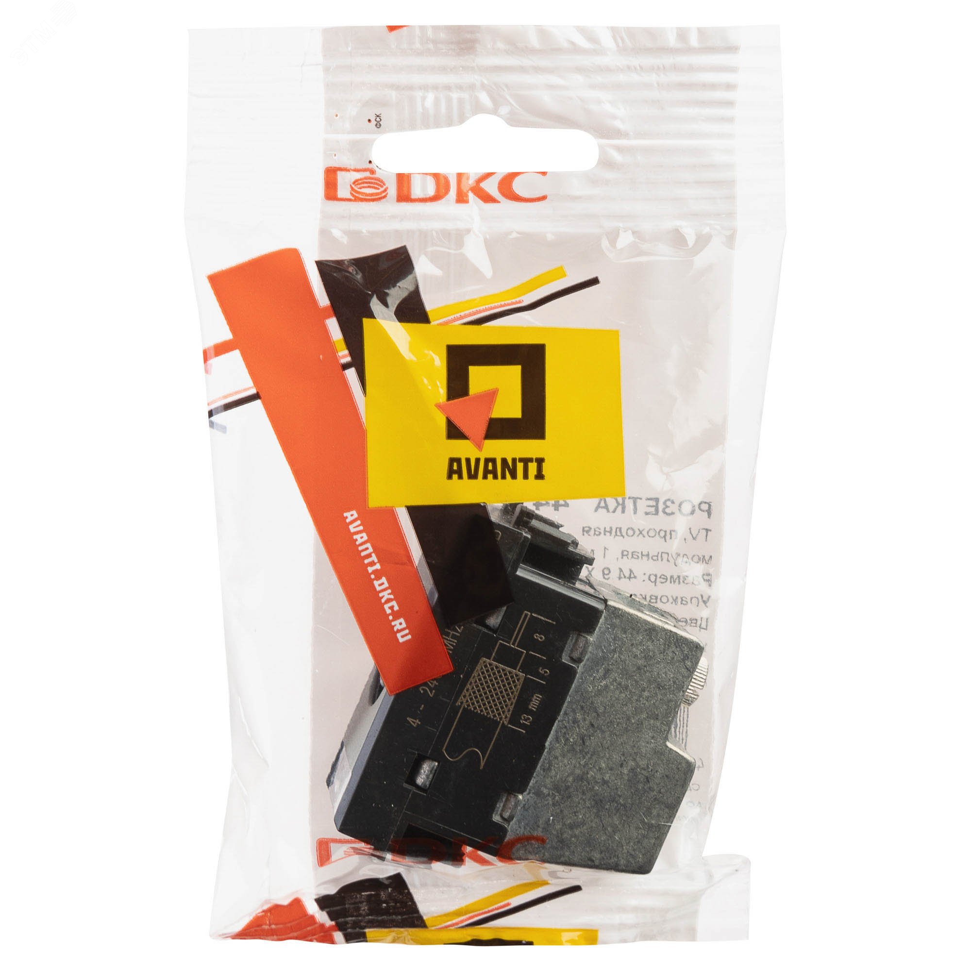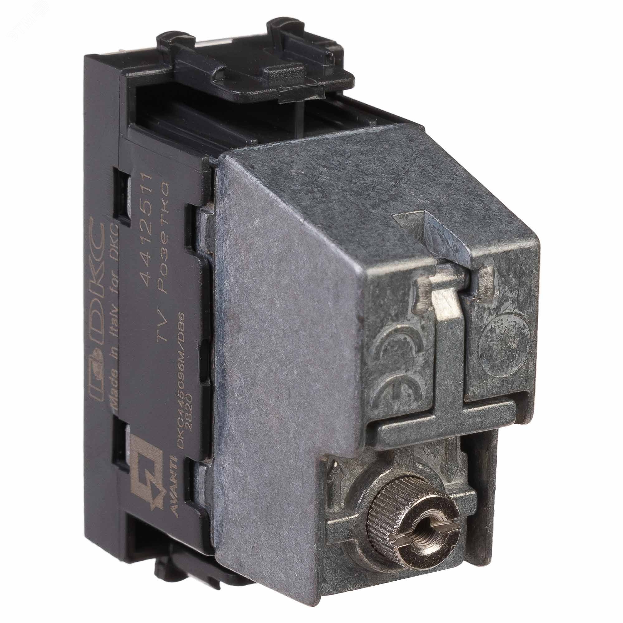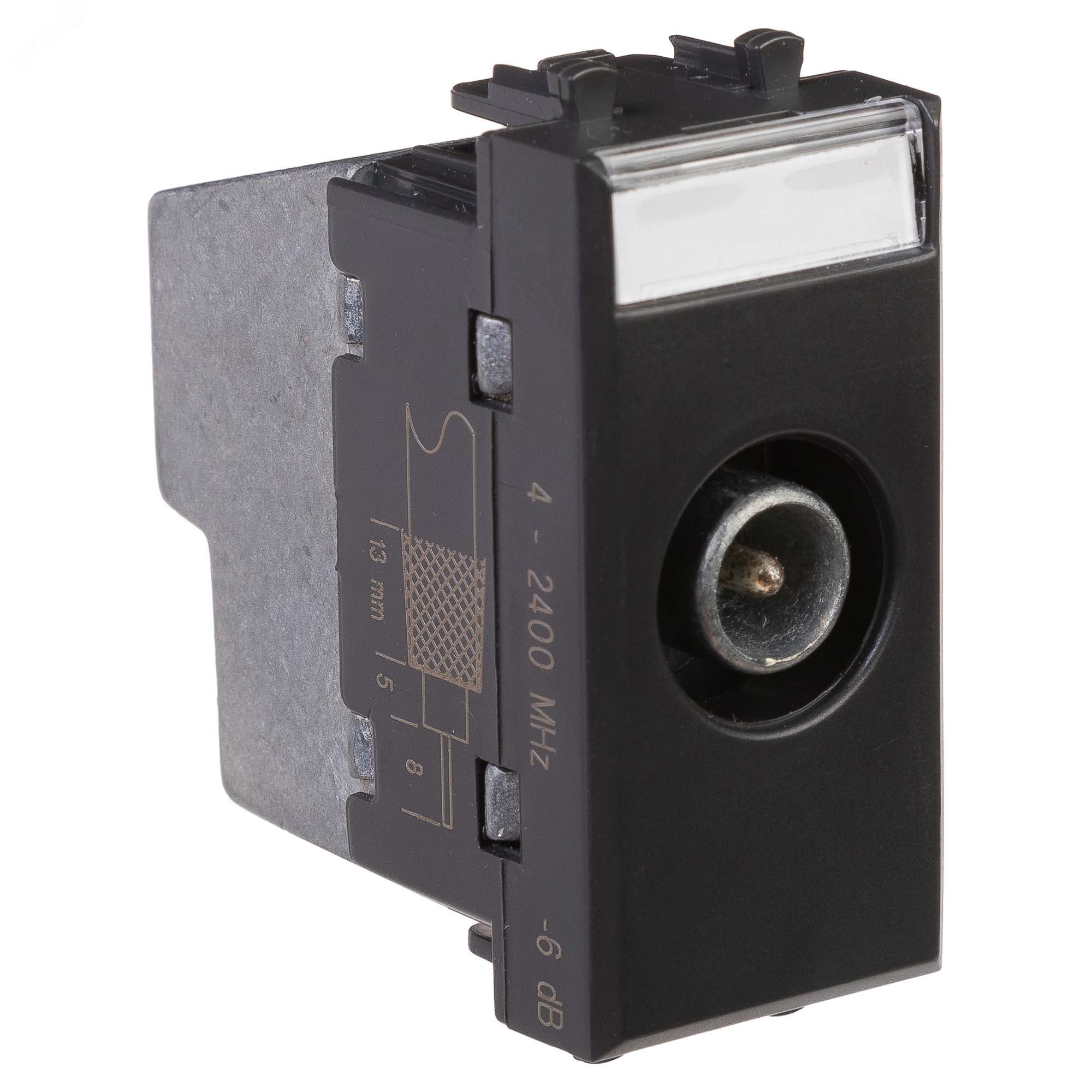Розетка TV проходная модульная. Предназначена для монтажа в систему пластиковых кабельных коробов ''In-liner Front'' и систему организации рабочих мест ''Sotto'' (в т.ч. кабель-каналы и короба ''Aero'') при помощи рамок-суппортов и каркасов ''Avanti'' (код 4400912 и т.д.). Используется для подключения телевизионного кабеля. Винтовые зажимы. Диапазон рабочих частот 4–2400 МГц, затухание