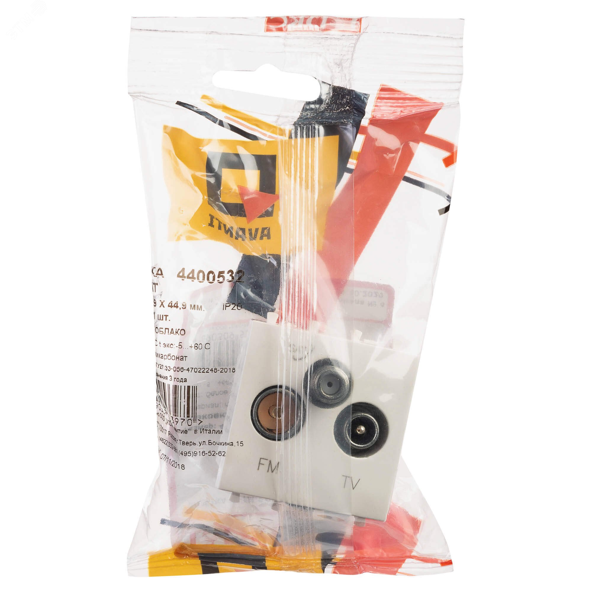 Розетка TV-FM-SAT модульная. Назначение- для монтажа в системы 'In-liner Front' и 'In-liner Aero' при помощи рамок-суппортов и каркасов 'Avanti' (код 4400912 и т.д.), подключения телевизионного и радиокабеля. Характеристики- винтовые зажимы, диапазон рабочих частот 4–2400 МГц, затухание