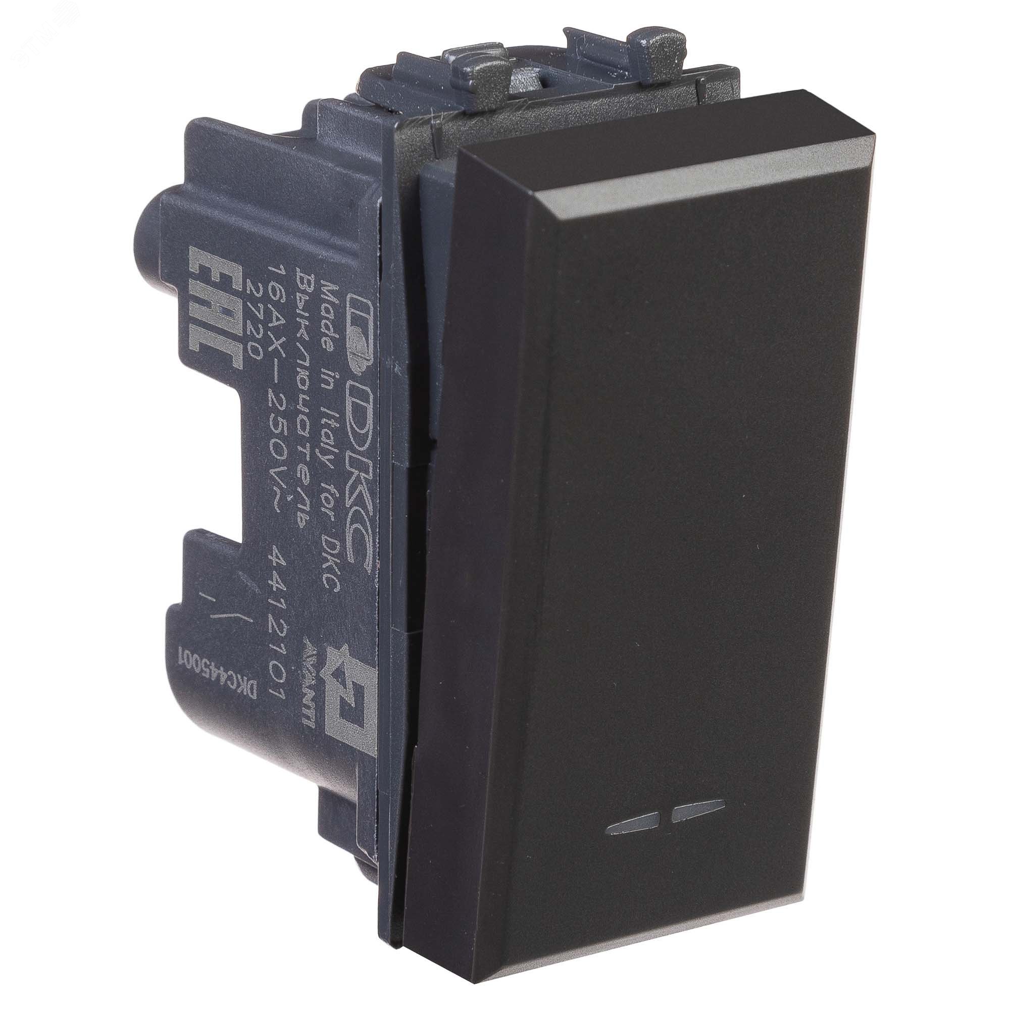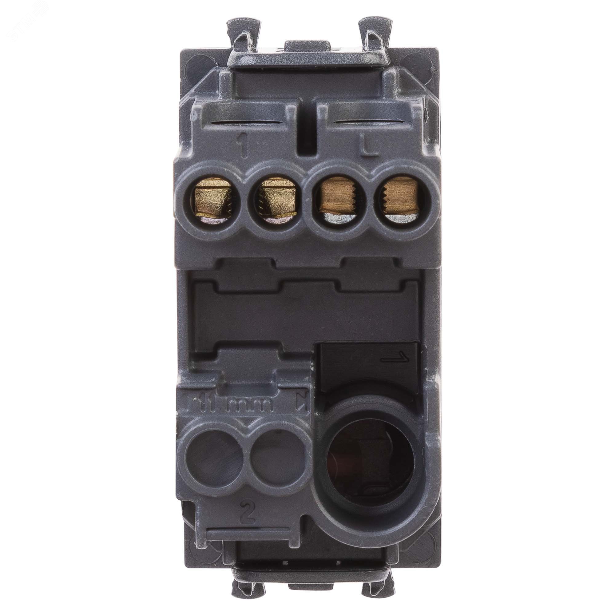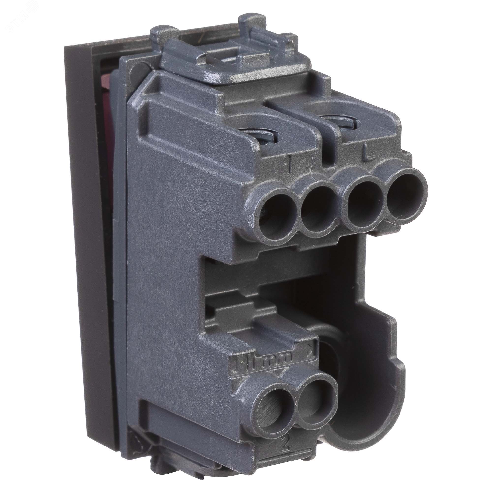Выключатель одноклавишный однополюсный, модульный. Предназначен для монтажа в пластиковые короба системы ''In-liner Front'', алюминиевые кабель-каналы и колонны ''Aero'' при помощи рамок-суппортов и каркасов ''Avanti'' (код 4400912 и т.д.). Используется для включения/выключения освещения. Характеристики – диаметр отверстий для ввода кабелей - 3 мм (по 2 отверстия на одну клемму), винтовые зажимы, шаблон для зачистки кабеля - 11 мм, номинальный ток - 16 A, номинальное напряжение - 230 В. Возможна фиксация в подрозеточные коробки при помощи каркаса с лапками (код 4400802) и саморезов. 1 модуль. Цвет – ''Черный матовый''.