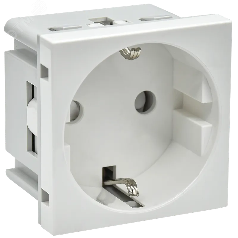 Силовая электрическая розетка штекерная. Назначение- подключение оргтехники, бытовых приборов и т. п. Характеристики- в соответствии с ПУЭ, пункт 7.1.49 ? имеются защитные шторки, автоматически закрывающие гнезда штепсельной розетки при вынутой вилке, имеется заземление, диаметр отверстий для ввода кабелей ? 3 мм (по 2 отверстия на клемму), номинальный ток ? 16 А, номинальное напряжение ? 250 B. Кол-во модулей- 1. Цвет- черный