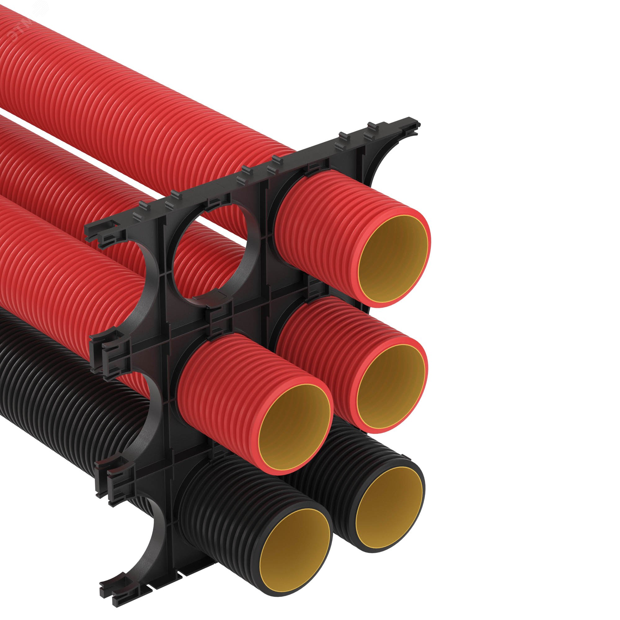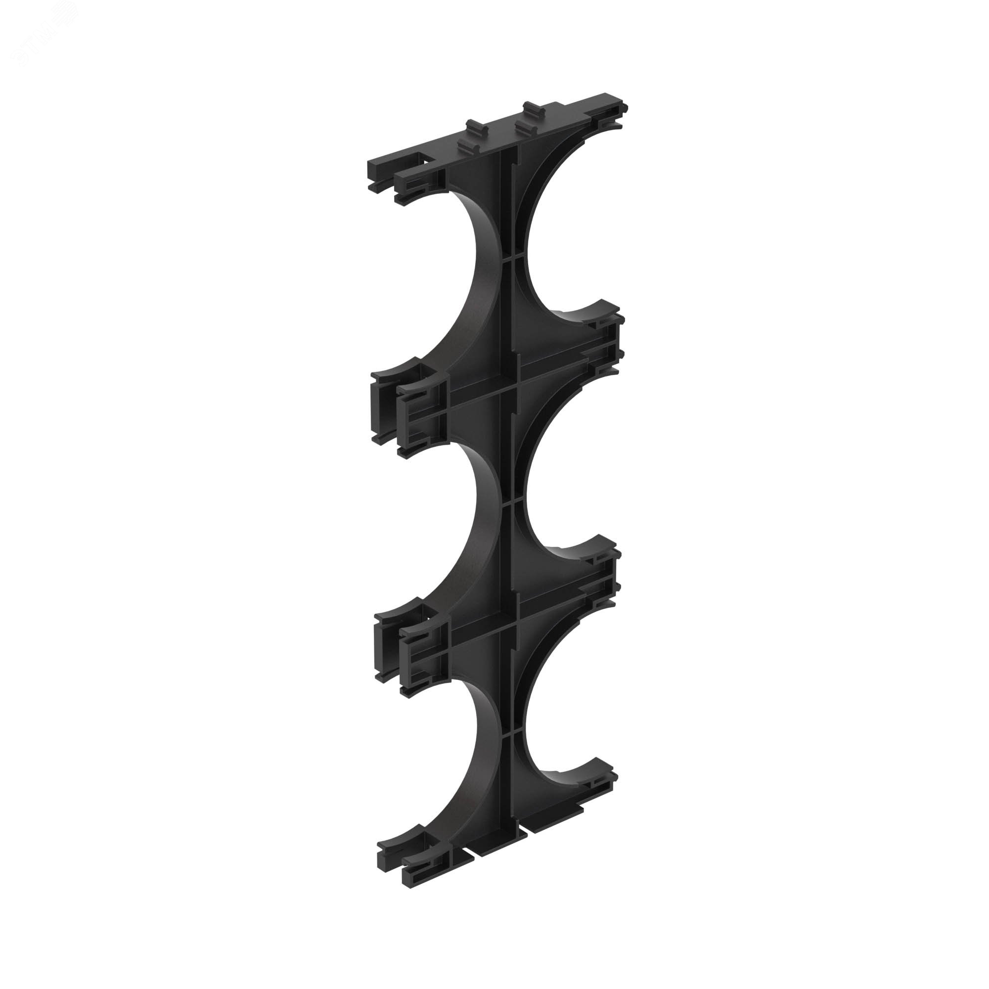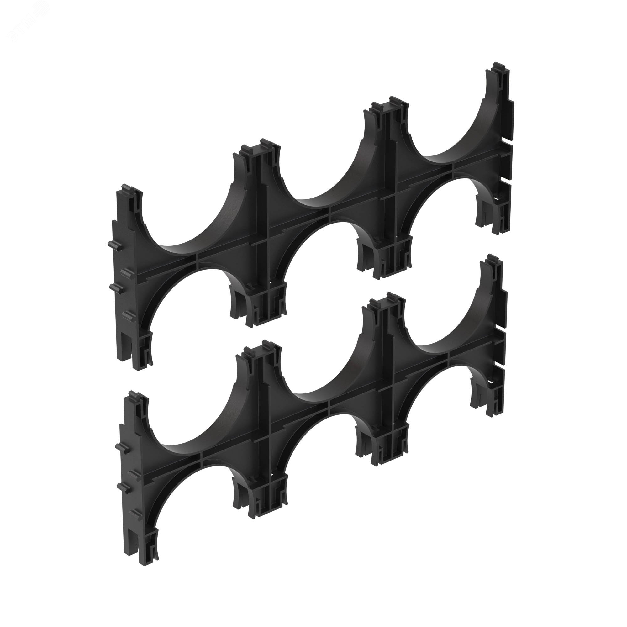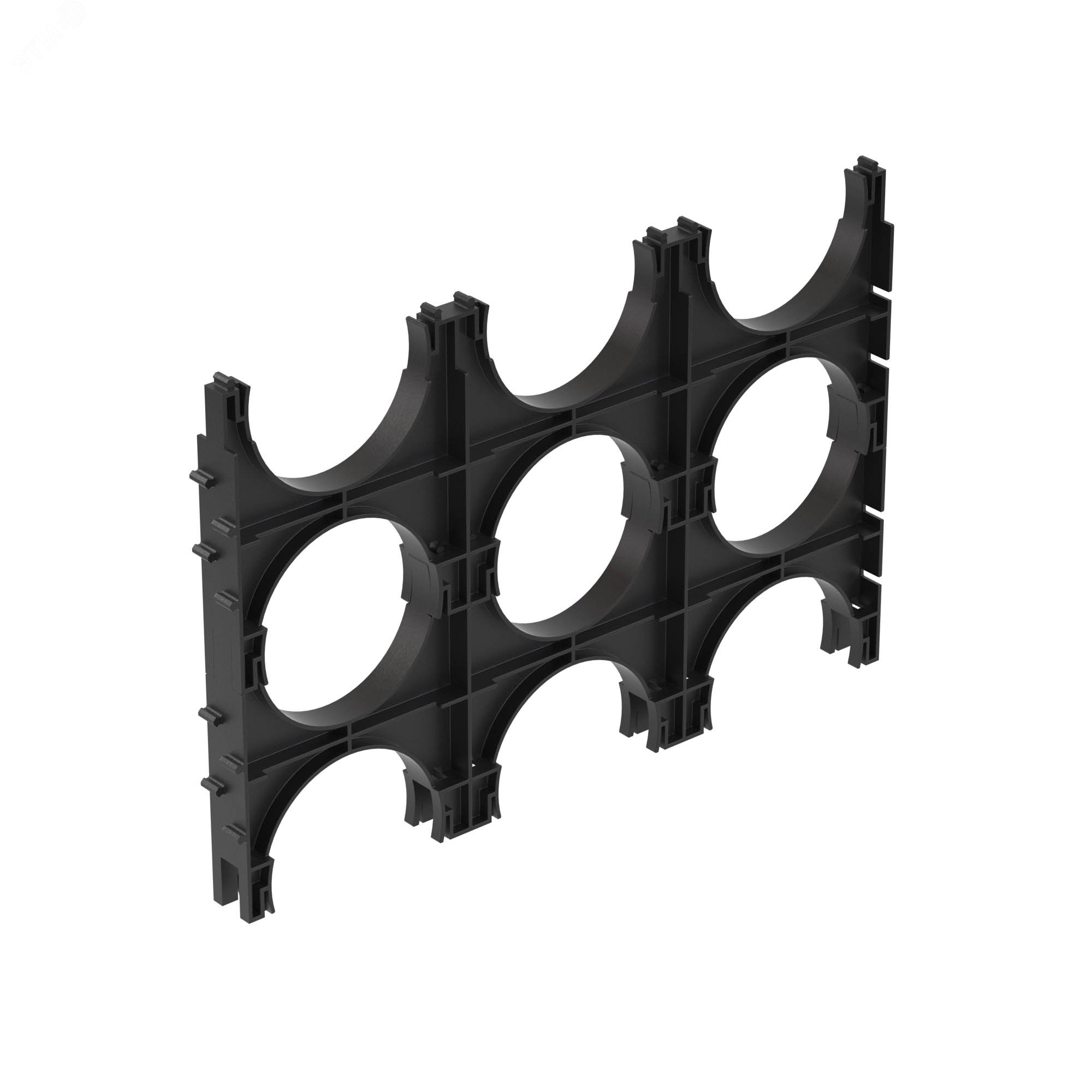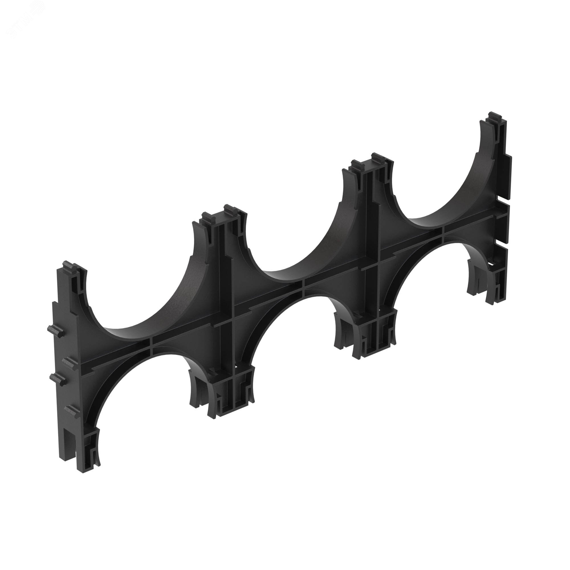 Держатель расстояния (кластер) применяется для сохранения расстояния между гибкими, жесткими, дренажными гофрированными двустенными трубами диаметром 110 мм. Используется для закрепления труб в горизонтальном или вертикальном положении. Препятствует смещению труб при монтаже и эксплуатации. Имеет пазы для крепления трех труб. Для размещения труб при блочном монтаже (в два и более ряда), держатели расстояния могут быть соединены между собой, при помощи специальных защелок. Возможен вариант как горизонтального, так и вертикального размещения блоков труб. Материал - полипропилен. Длина – 441,3 мм, высота – 165,5 мм, цвет – черный, температура эксплуатации – от –40 до +90 градусов Цельсия.