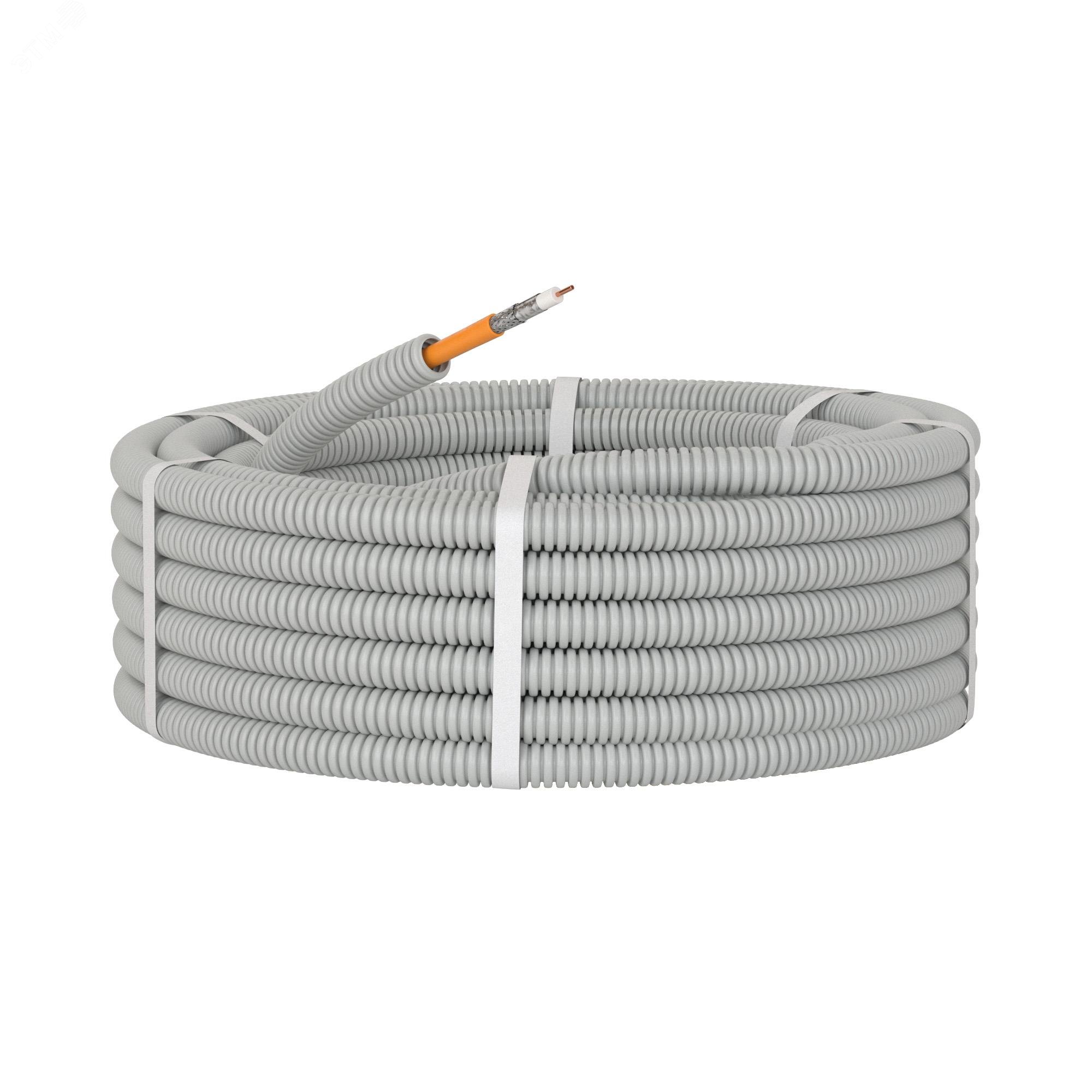 Электротехнические гибкие гофрированные трубы из ПВХ используются для прокладки в стенных штробах, в пустотах фальш-потолков и фальш-стен, в стяжке полов или под фальш-полами. Электротруба - это гофрированная труба с уже протянутым внутри коаксиальным кабелем SAT нг(А)-HF. Такое решение значительно сокращает время монтажа и предупреждает возможное повреждение кабеля при протяжке. Характеристики кабеля: класс экранирования - А, диаметр по изоляции - 4,8 мм, волновое сопротивление 75 Ом, тип исполнения - нг(А)-HF. Характеристики трубы: гофрированная труба ПВХ диаметром 20мм, цвет - серый. 50м в бухте.