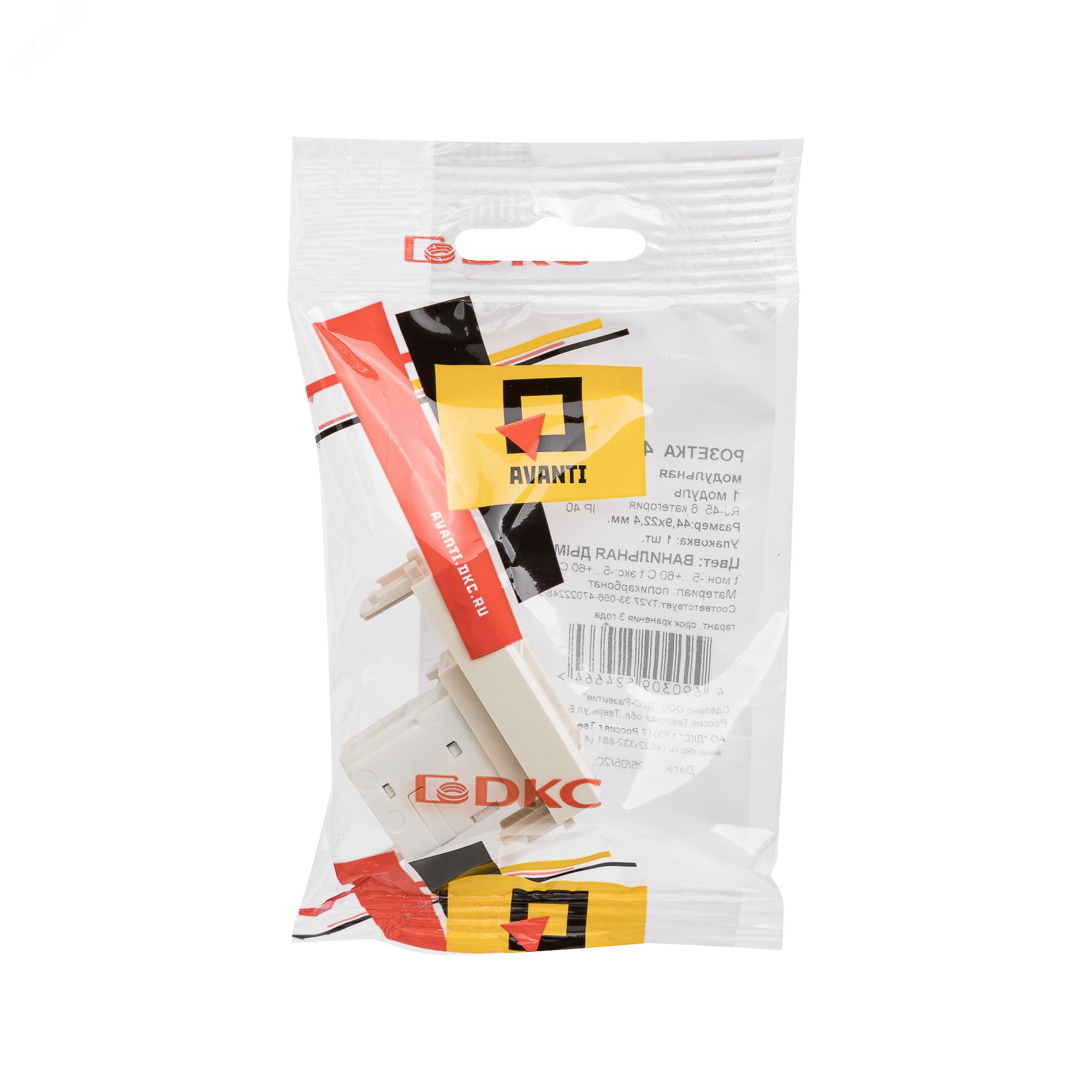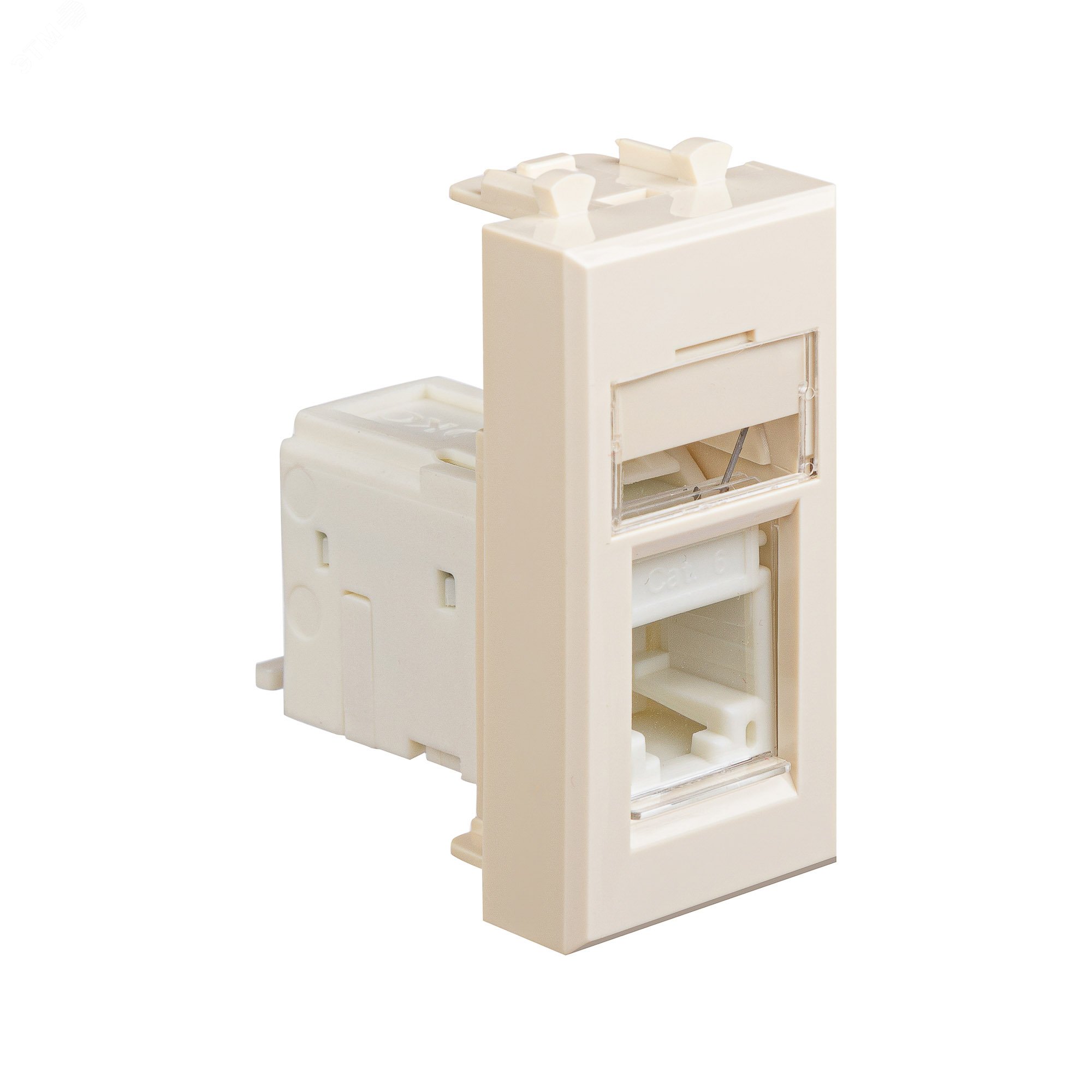 Компьютерная розетка RJ-45 модульная. Категория: 6. Предназначена для монтажа в систему кабельных коробов ''In-liner Front'' и систему организации рабочих мест ''Sotto'' при помощи рамок-суппортов и каркасов ''Avanti'' (код 4400912 и т.д.). Используется для подключения сетевого кабеля к рабочему месту. Характеристики: 8P8C, с пылезащитной шторкой, с маркировочной табличкой, в комплекте разъем Keystone, заделка без инструмента. Фиксация производится в подрозеточные коробки глубиной не менее 45 мм при помощи каркаса с лапками (код 4400802) и саморезов. 1 модуль. Цвет: ''Ванильная дымка''