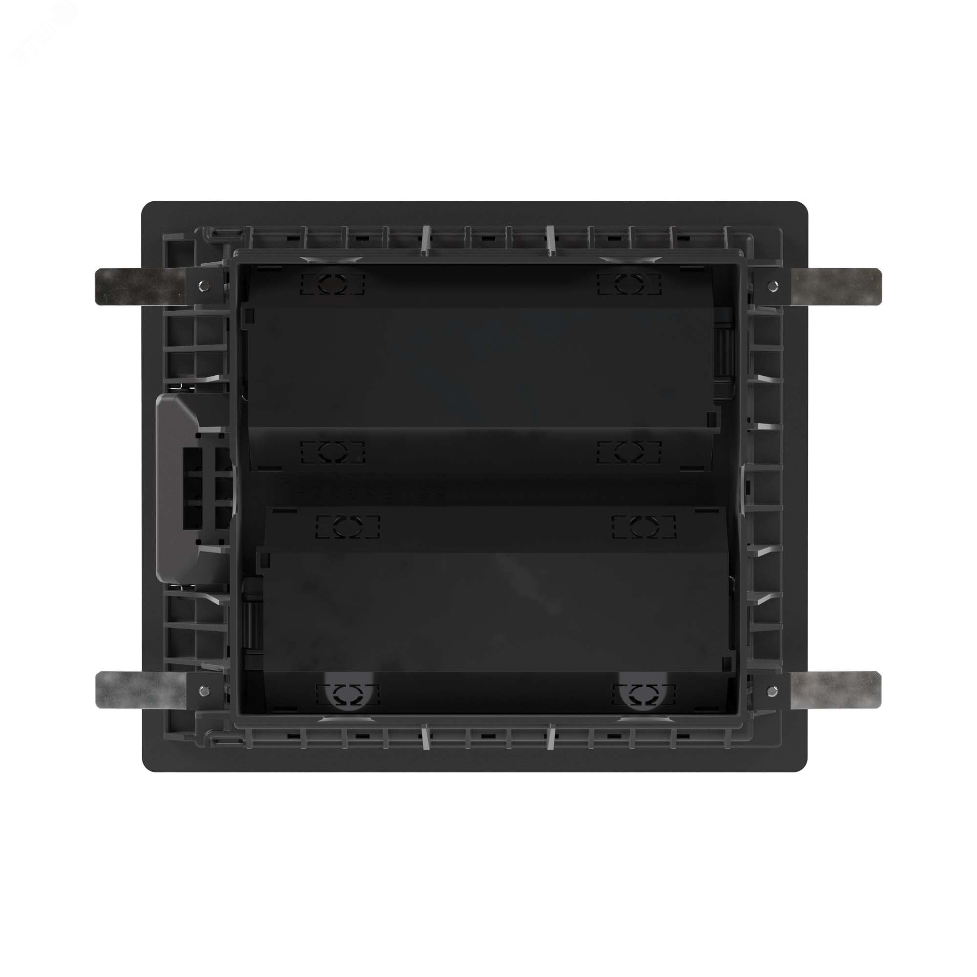 Лючок напольный с изменяемой глубиной на 8 модулей. Назначение – организация рабочих мест в помещениях с открытым пространством. Устанавливается в фальшполах (толщина плит 20-45 мм), отверстие для монтажа 218х182 мм. Глубина монтажа от 73 до 108 мм. Крышка усилена стальным листом, нагрузка на малую площадь – 2000 Н, на большую площадь – 5000 Н (ГОСТ 61084-2-2-2022), допустимая нагрузка на крышку 450 кг (ГОСТ 61084-2-2-2007). Возможна установка ЭУИ Viva, Avanti. Монтаж в 2 подрозеточных блока на 4 модуля каждый. Каркасы, рамки и ЭУИ заказываются дополнительно. Цвет – черный.