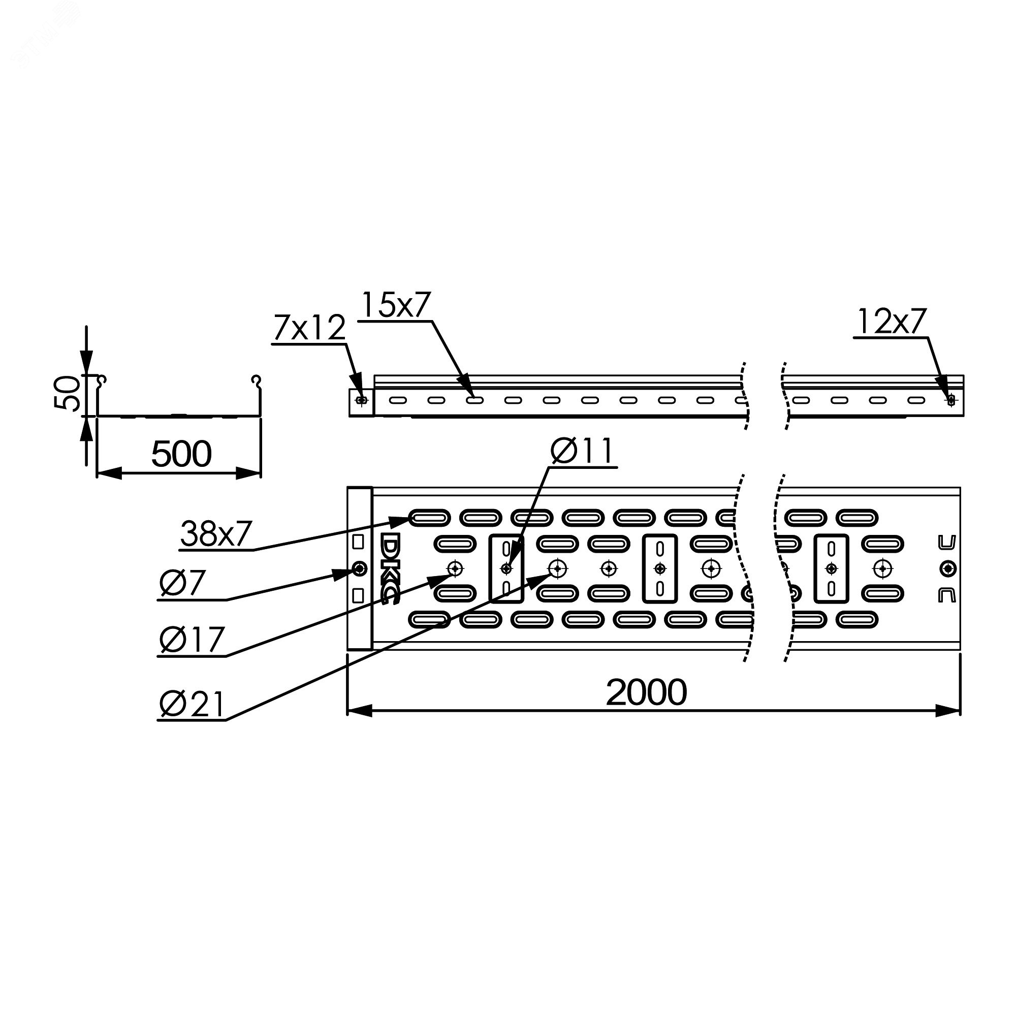 Характеристики: Лоток перфорированный 500х50х 2000 цинк-ламельный