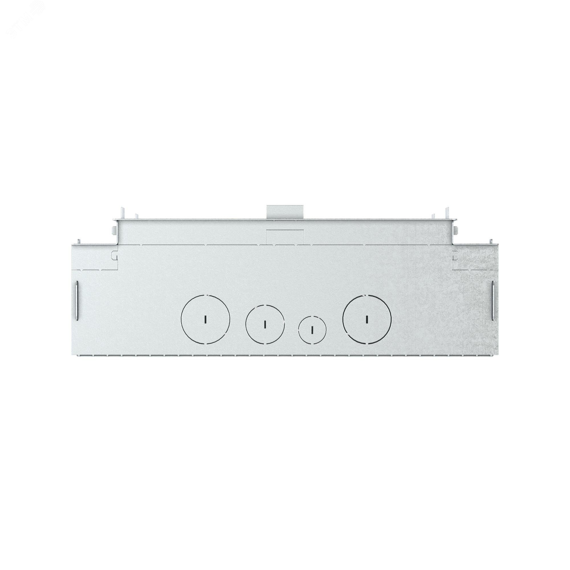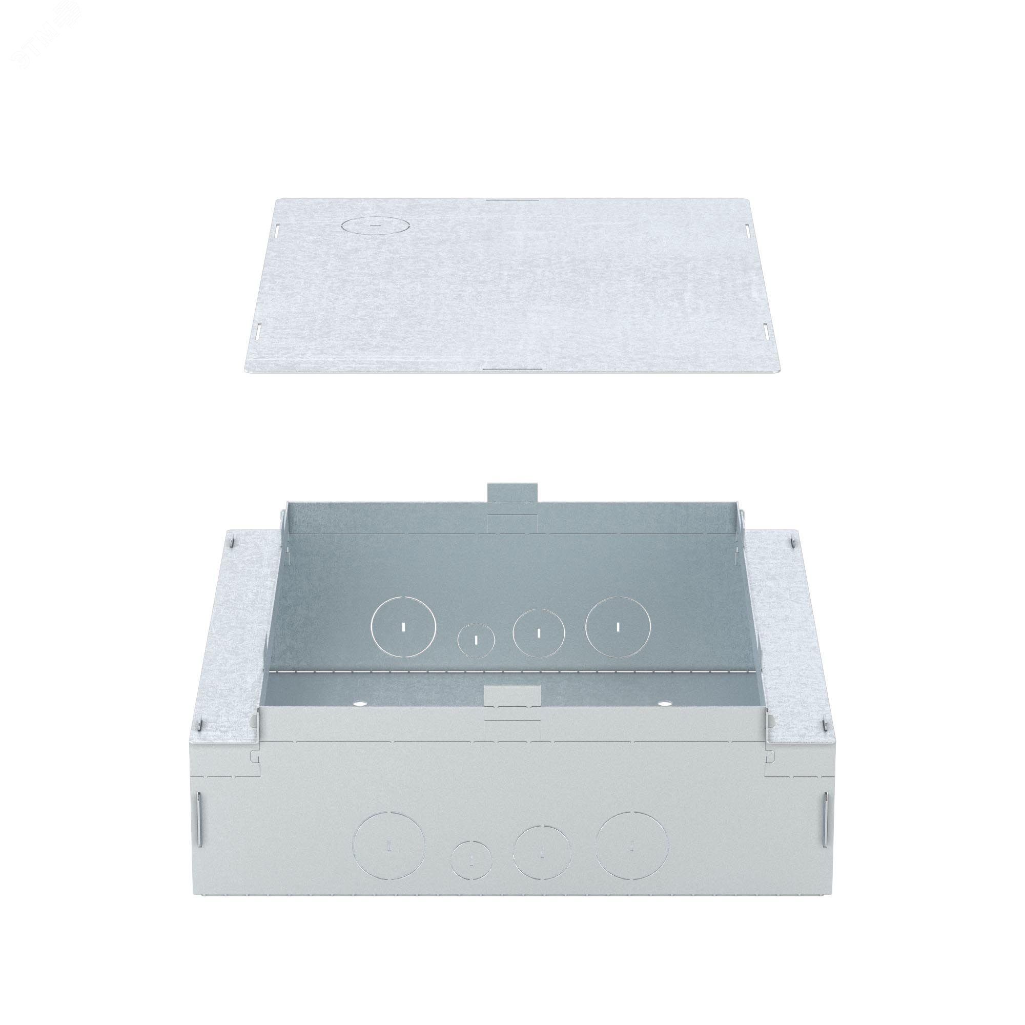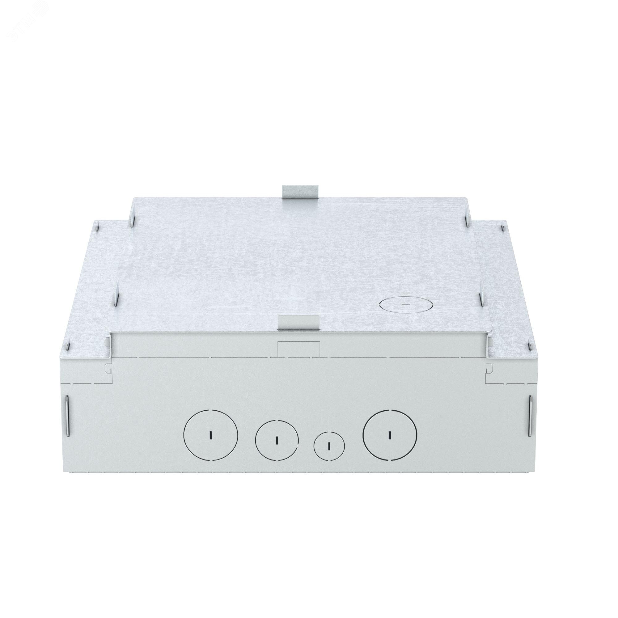 Монтажное основание для лючков с изменяемой глубиной на 24 модуля (код лючка 88324). Назначение – организация рабочих мест с помощью лючка в стяжке. Материал упрощенного монтажного основания – оцинкованная сталь. Минимальная высота стяжки – 90 мм. Максимальная высота стяжки – 110 мм. Габаритные размеры – 344х344х110 мм. Временная крышка (стальная идет в комплекте с опалубкой) удаляется сразу после заливки. Лючок устанавливается на место временной крышки. С четырех сторон на боковых стенках находится перфорация для подвода электрических труб различных диаметров. Клемма для заземления расположена внутри опалубки, на дне.