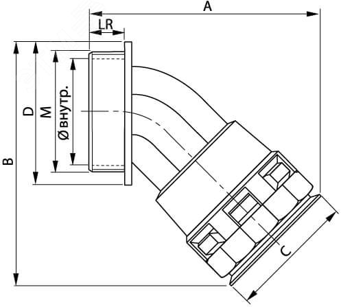 Муфта 45 градусов 'труба-коробка', IP65/IP67. Номинальный диаметр 36 мм. Материал – полиамид (PA6.6). Цвет: черный. Температура эксплуатации от -40 до +105 градусов по Цельсию (кратк. воздействие до +150 градусов по Цельсию). Степень защиты IP65 без уплотнителей PAPM и IP67 с уплотнителями PAR и PAPM. Простая и надежная стыковка с трубой. Не содержит галогенов. Используется для ввода гофрированных полиамидных труб в корпуса оборудования, шкафы, щитки, распаечные коробки под углом 45 градусов.