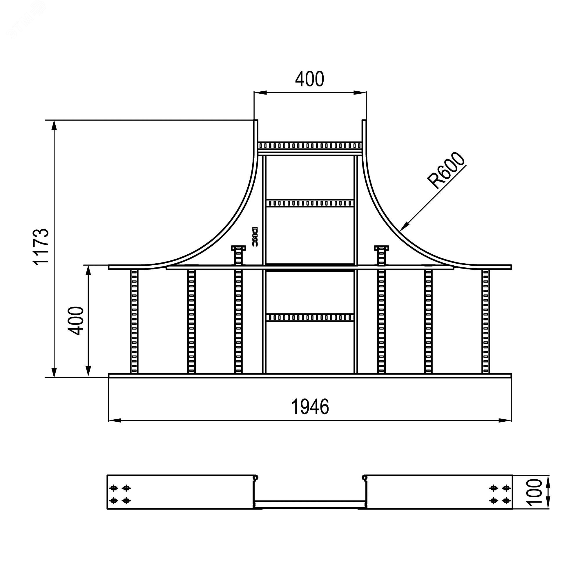 Т-образный ответвитель позволяет создавать ответвления трассы в горизонтальной и вертикальной плоскости. Позволяет проложить кабели с большим сечением благодаря радиусу изгиба R600. В состав комплектного аксессуара входят соединительные пластины и крепежные элементы, необходимые для надежного и качественного монтажа. Ширина – 400 мм, высота – 100 мм. Толщина лонжерона изделия – 1,5 мм, а толщина поперечины – 1,0 мм. Данное изделие представлено в исполнении ''Сталь, оцинкованная по методу Сендзимира''.