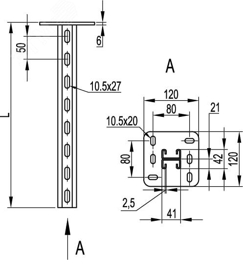 Вертикальный подвес BSD-21 используется при монтаже кабельных трасс на консолях - ВВН-60, ВВН-70, BBD-21, ВВР-21/41. Одно/двусторонний и параллельный монтаж кабельных трас. Они крепятся вертикально - к полу или потолку. С-образный двойной профиль подвеса 41х21 мм. Длина 600 мм, толщина профиля подвеса - 2,5 мм, толщина пластины - 6 мм. В основании 6 отверстий под метизы М10.