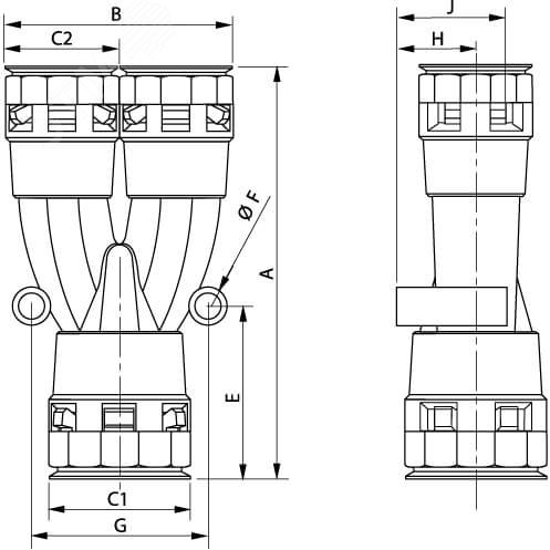 Разветвитель, IP65/IP67. Номинальный диаметр: один - 48 мм и два - по 36 мм. Материал – полиамид (PA6.6). Цвет: черный. Температура эксплуатации от -40 до +105 градусов по Цельсию (кратк. воздействие до +150 градусов по Цельсию). Степень защиты IP65 без уплотнителей PAPM и IP67 с уплотнителями PAR и PAPM. Простая и надежная стыковка с трубой. Не содержит галогенов. Используется для V-образного разветвления гофрированных полиамидных труб.